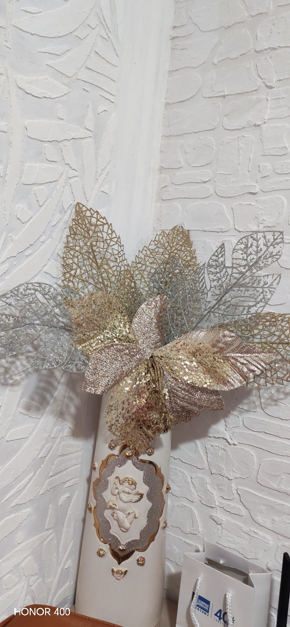 A white vase with a decorative angel and golden accents is displayed against a textured white wall, adorned with gold and silver artificial floral arrangements. Part of a white gift bag with blue branβ¦read more