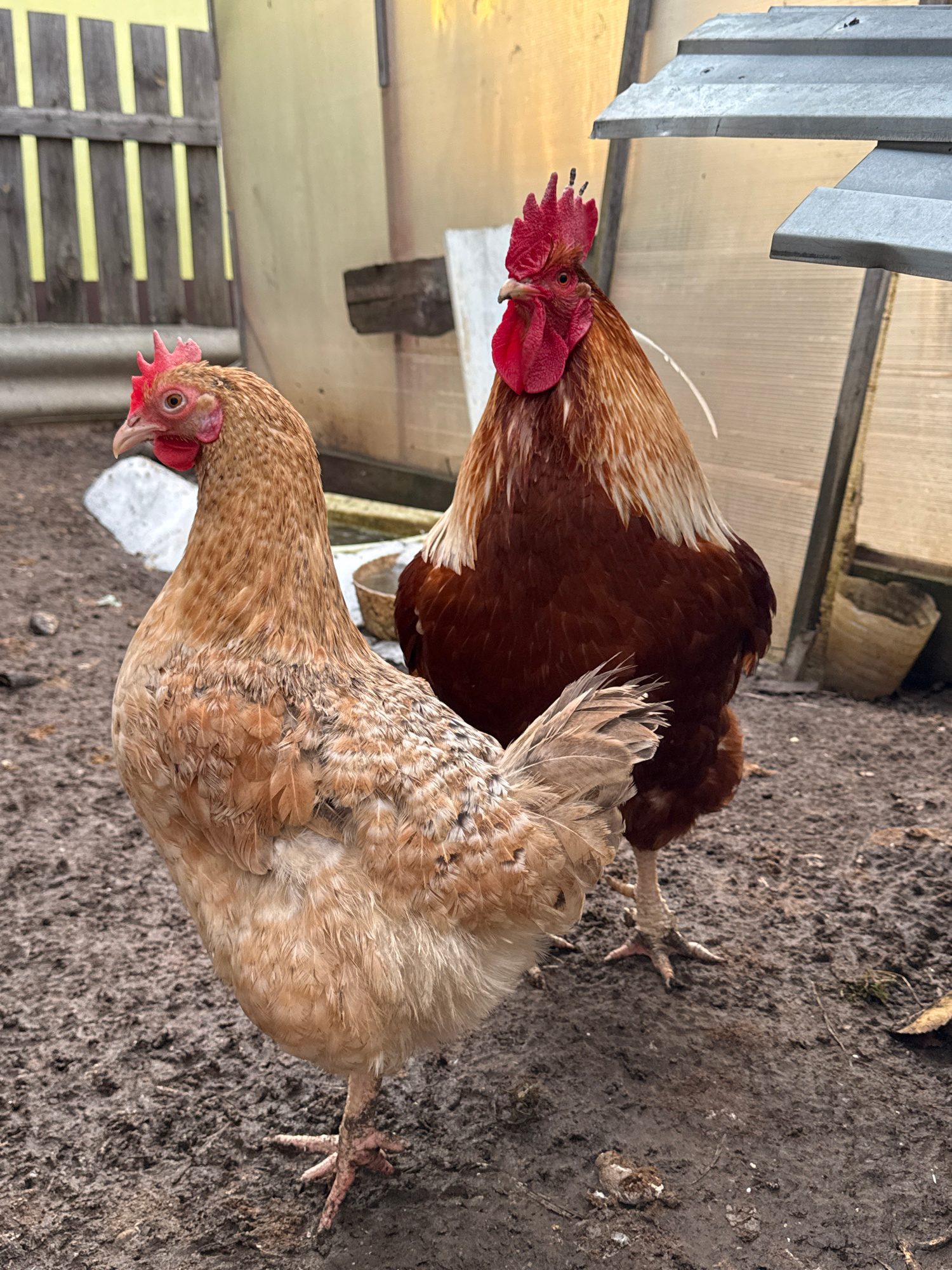 Two chickens, a light brown hen and a darker brown rooster with white markings, stand on dark, muddy ground. A partially visible wooden fence is in the lower left corner, and corrugated metal and a tr…read more
