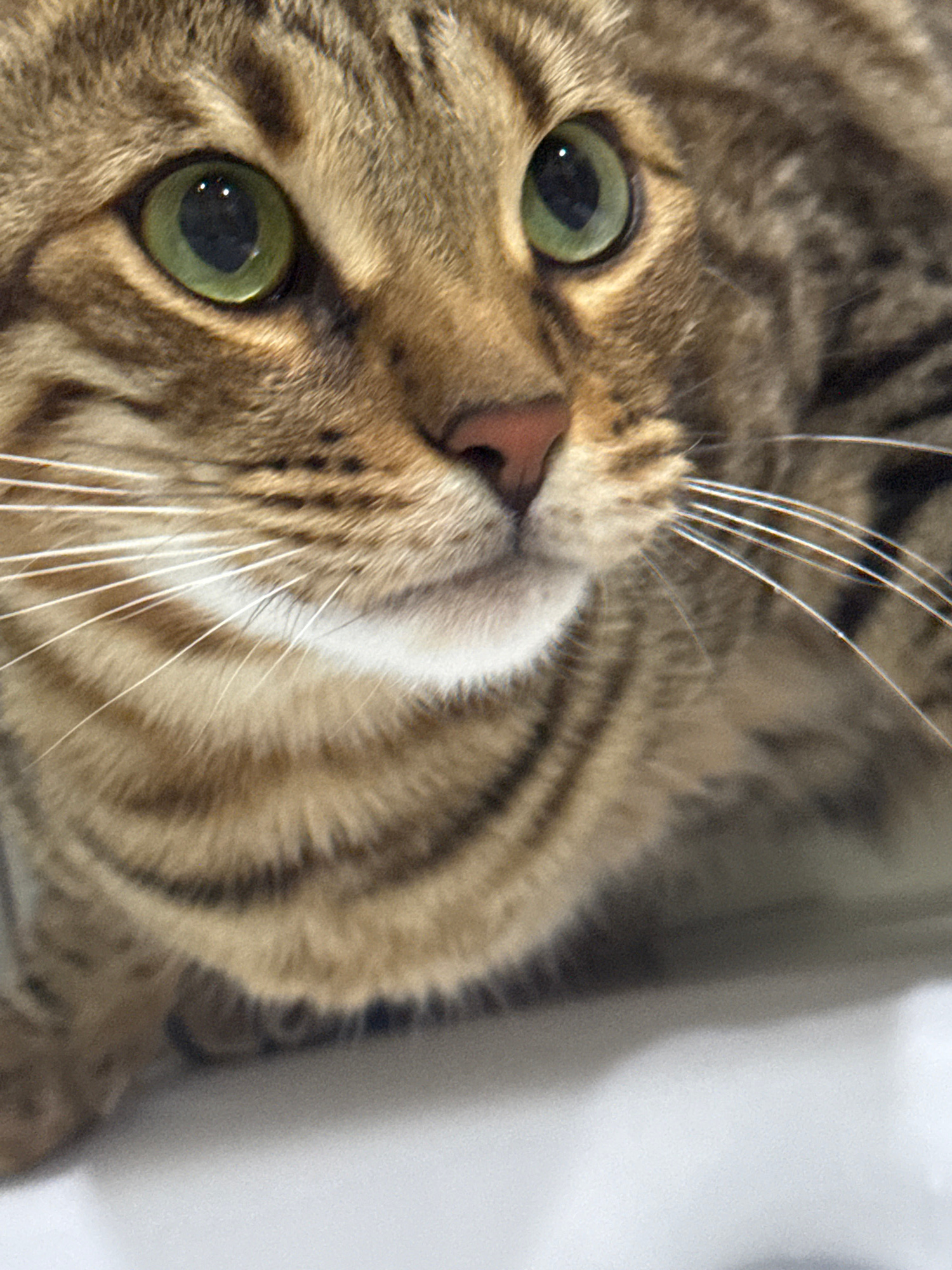 Close-up, tilted view of a brown tabby cat with green eyes. The cat is looking upwards with visible whiskers. The background is indistinct. There is no evidence to suggest this image was taken in Votk…read more