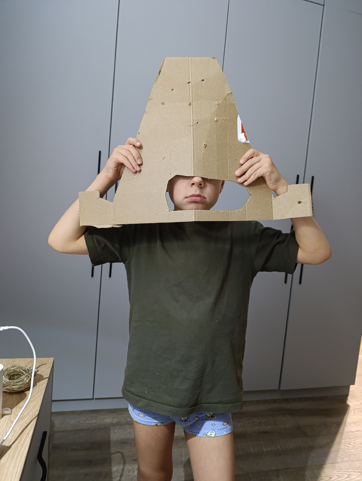 A boy stands indoors, holding a large, brown, cardboard letter "A" in front of his face. The letter has several holes in it. The boy is wearing a dark green t-shirt and blue underpants with cartoon-li…read more