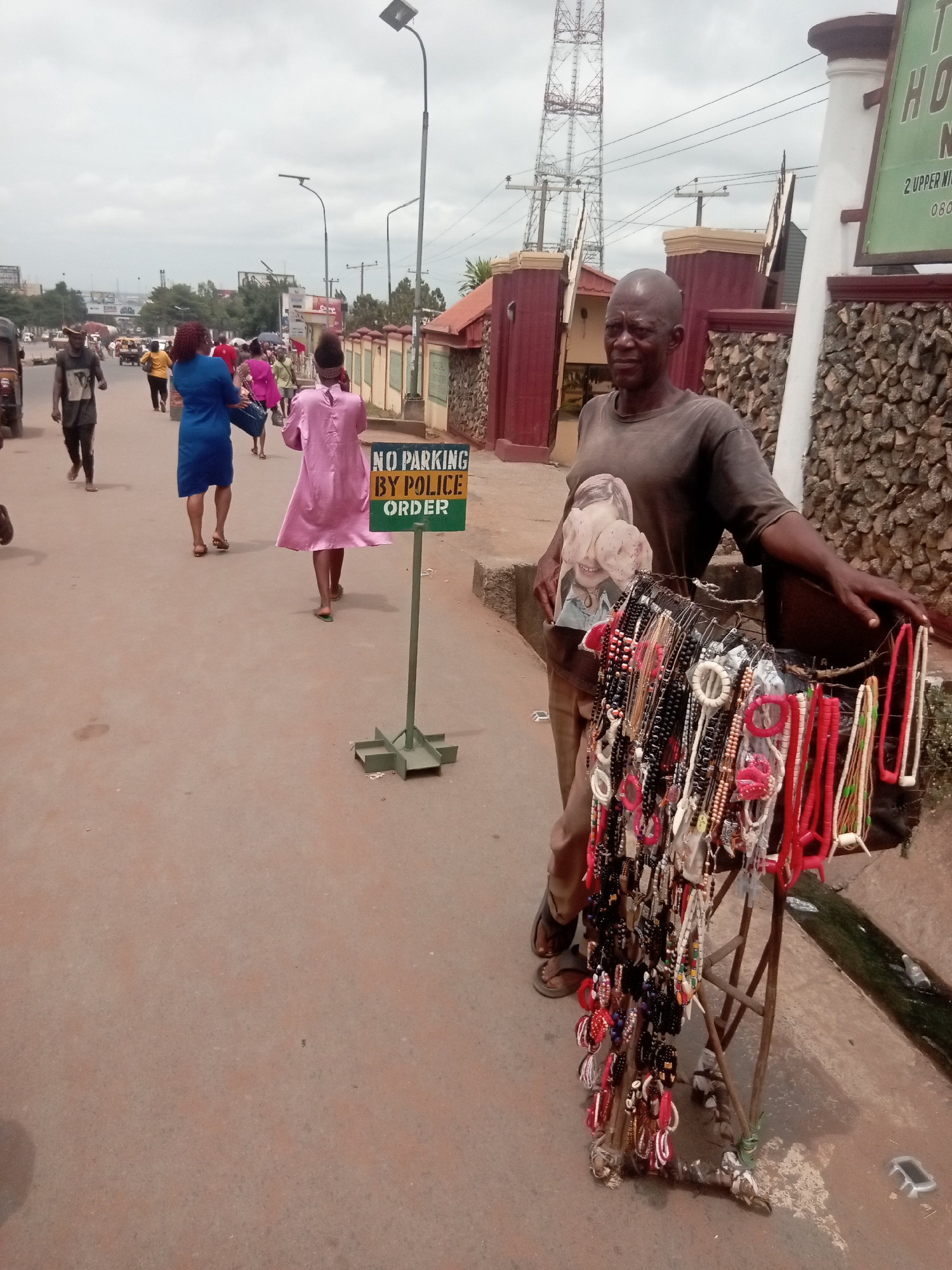 A man stands on the side of a road in Onitsha, Nigeria, beside a display of necklaces and bracelets on a small stand. The road is a light brown color. The man is dark-skinned, with a shaved head, and…read more