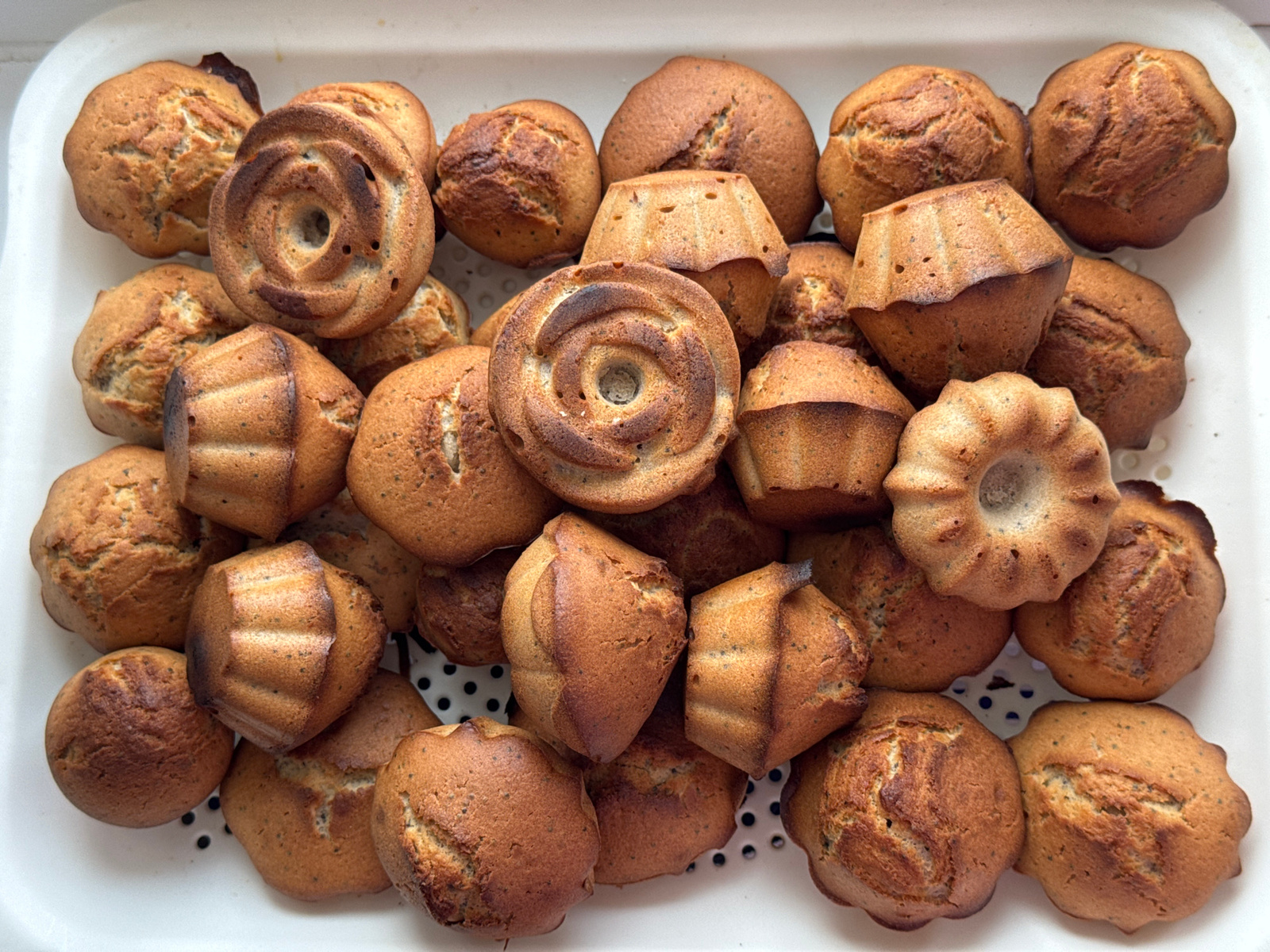 A high-angle shot shows a white tray filled with an assortment of muffins. The muffins are of different shapes, some round, some with flower-like designs, and some with a distinctive geometric shape.…read more