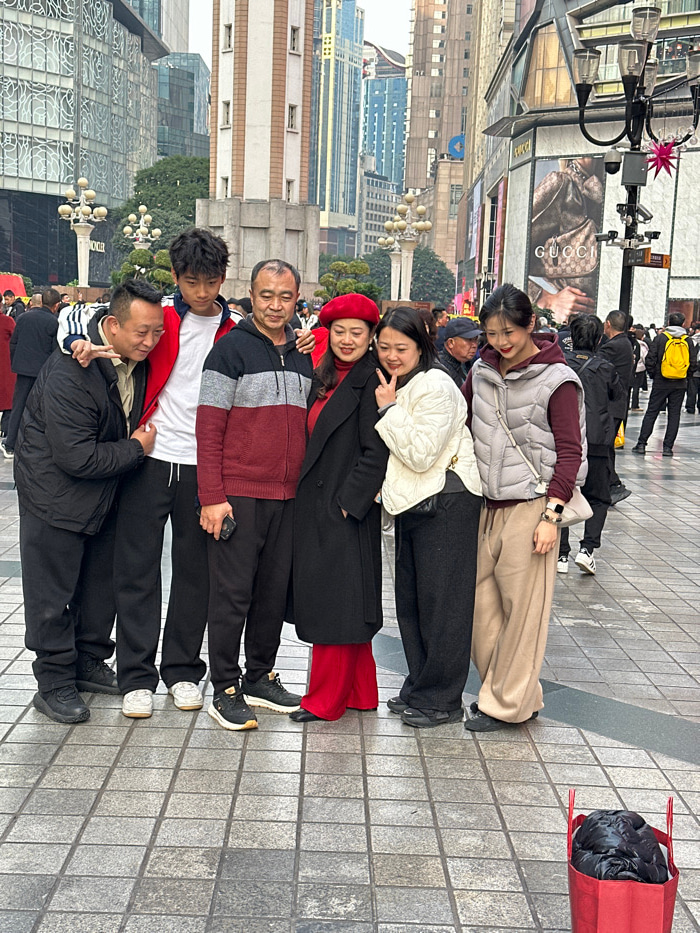 The image depicts six individuals, appearing to be of East Asian descent, posing for a photograph on a paved pedestrian street in the Jiefangbei commercial district of Yuzhong District, Chongqing, Chi…read more