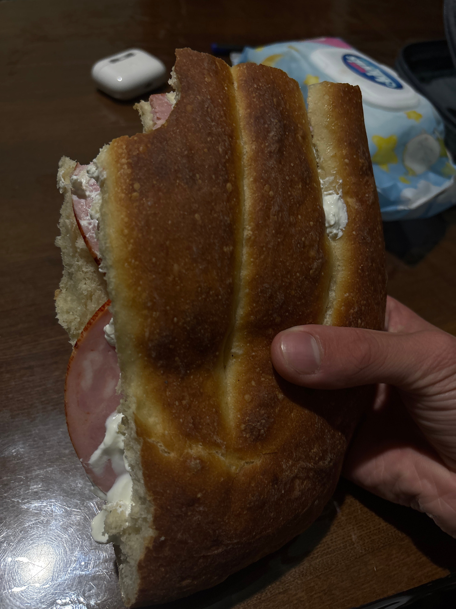 A partially eaten sandwich is held in someone's hand. The sandwich consists of two halves of brown bread with visible filling of ham and a white spread (possibly cream cheese). A bite has been taken o…read more
