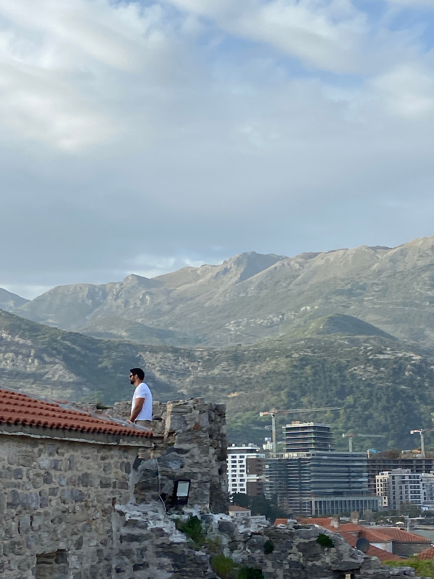 A man with a dark beard is standing on a high stone wall with a red-tiled roof, looking out over a mountainous landscape. The man is wearing a white t-shirt. The city of Budva, Montenegro, is partiall…read more