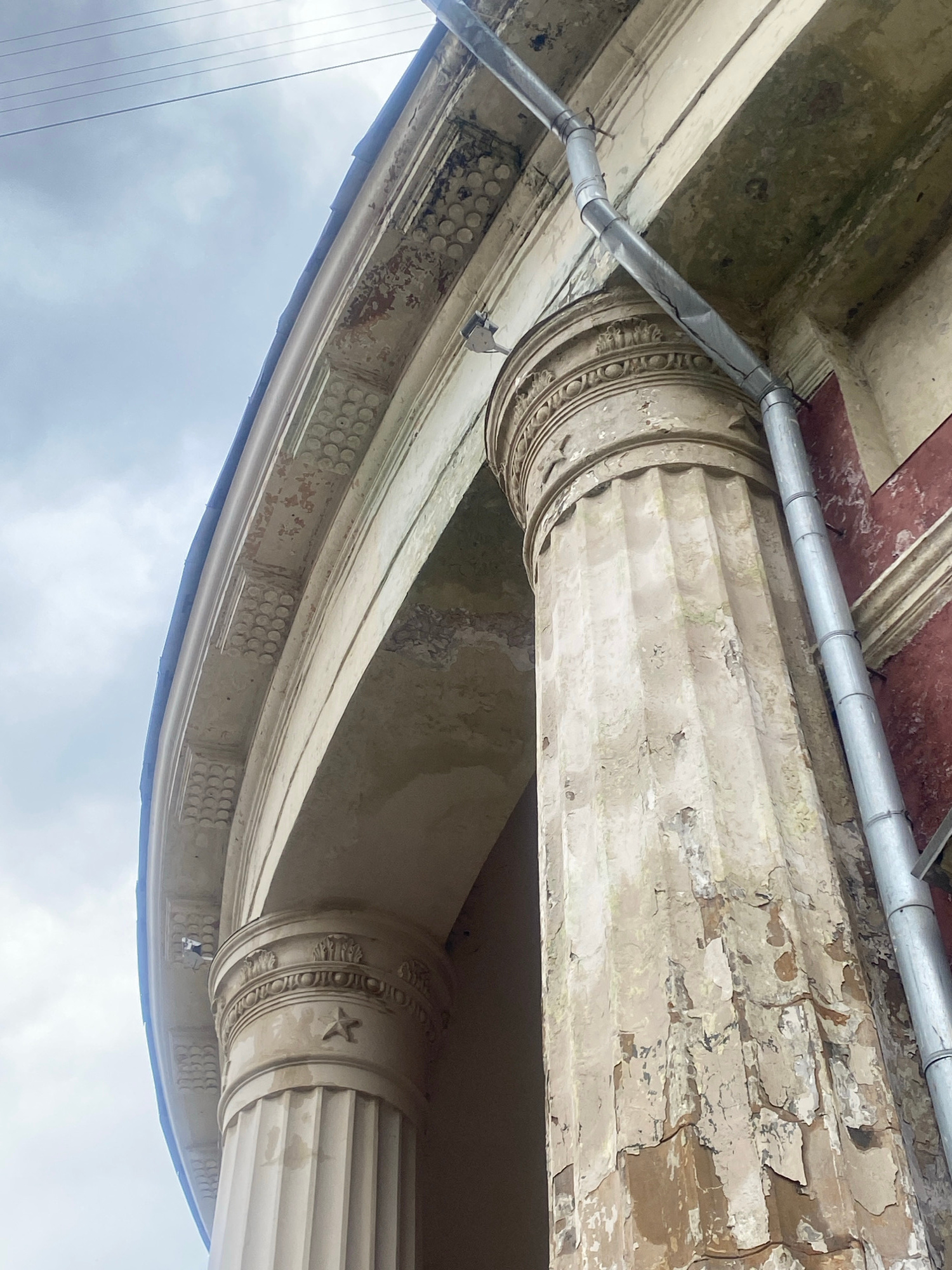 The image presents a detailed, low-angle view looking upwards at the weathered architectural elements of a grand building, likely in Moscow, Russia, against an overcast sky. The primary subjects are…read more