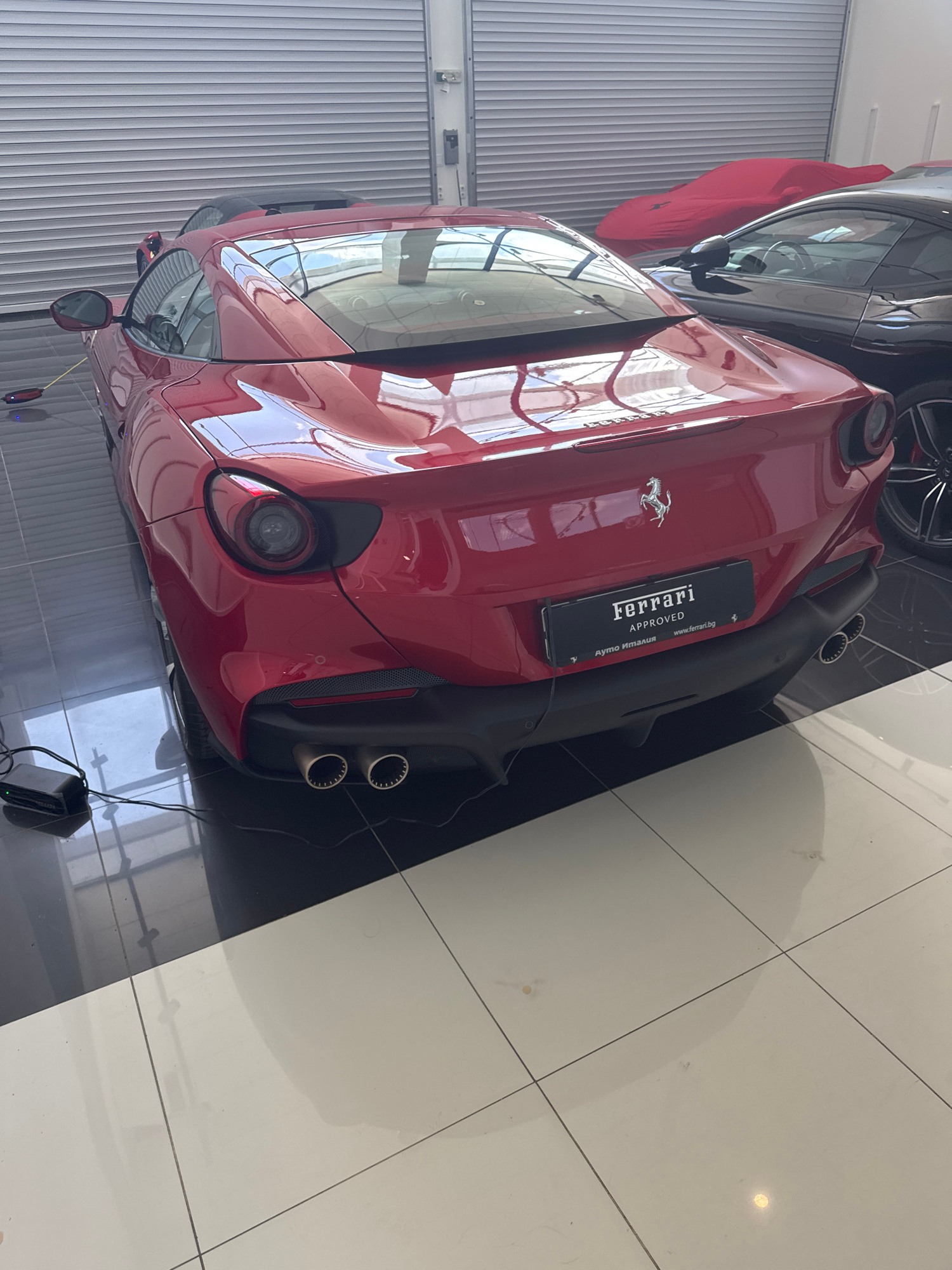 The media file captures an indoor scene, likely a luxury car showroom or garage, centered on the rear of a vibrant red Ferrari sports car. The car is prominently displayed on a floor composed of large…read more