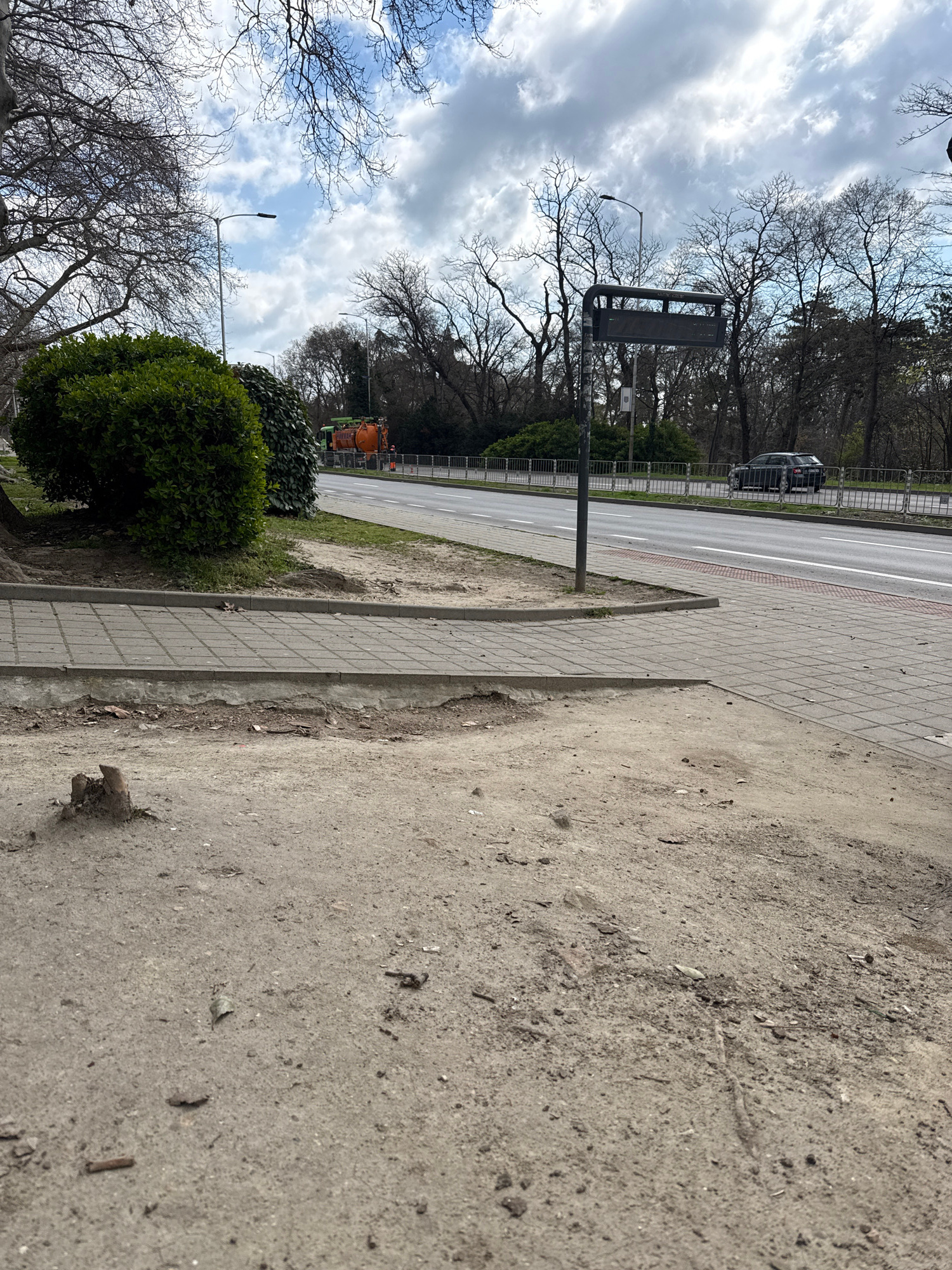 The image shows a street scene in Varna, Bulgaria, taken on a cloudy day. A sidewalk composed of grey paving stones is visible on the right side of the frame. The sidewalk is uneven, with patches of d…read more
