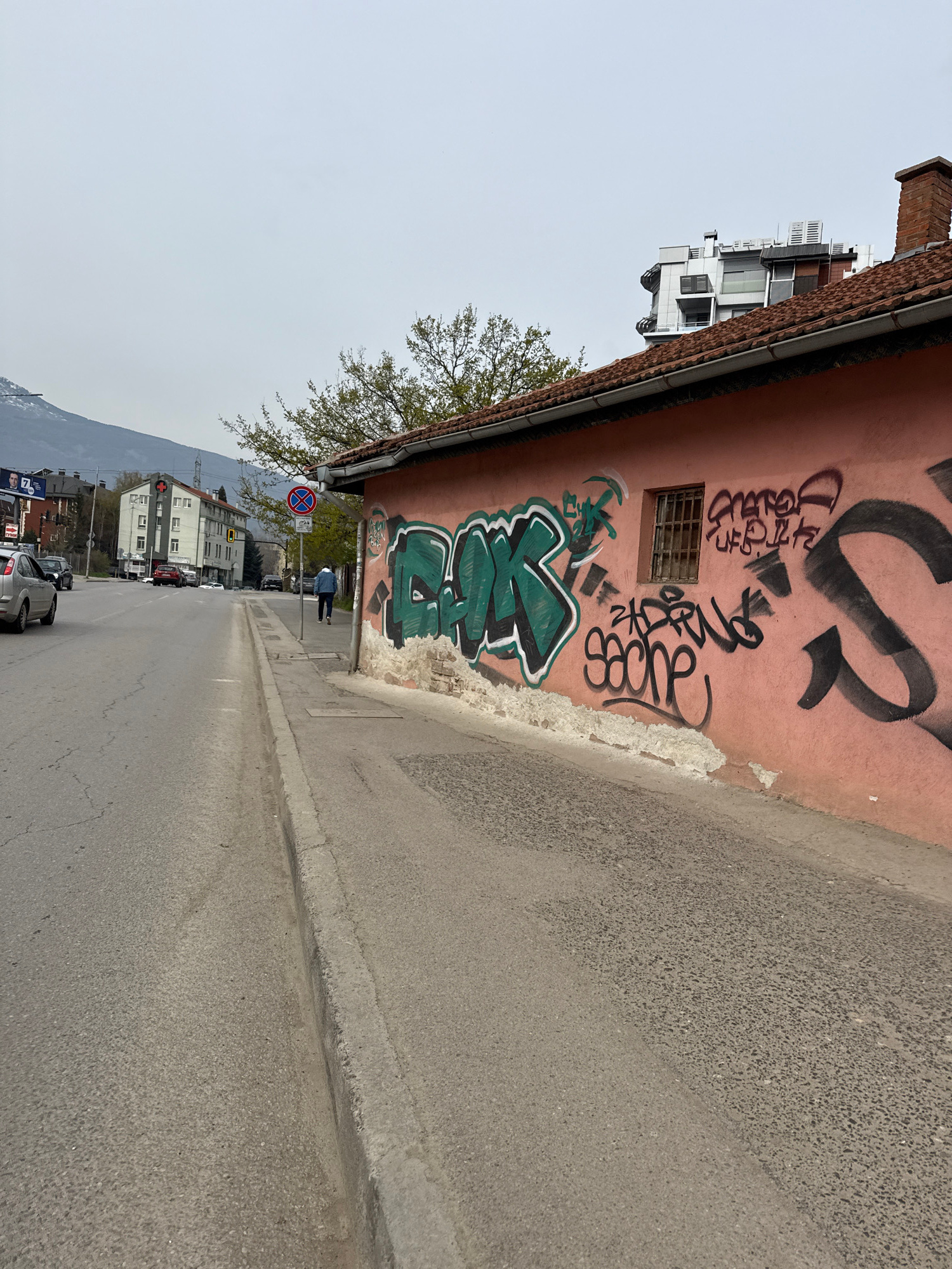 The image depicts a street scene in Sofia, Bulgaria. The view is along a narrow road with a sidewalk. On the right side of the image is a building with a salmon-colored wall covered in graffiti. A sma…read more
