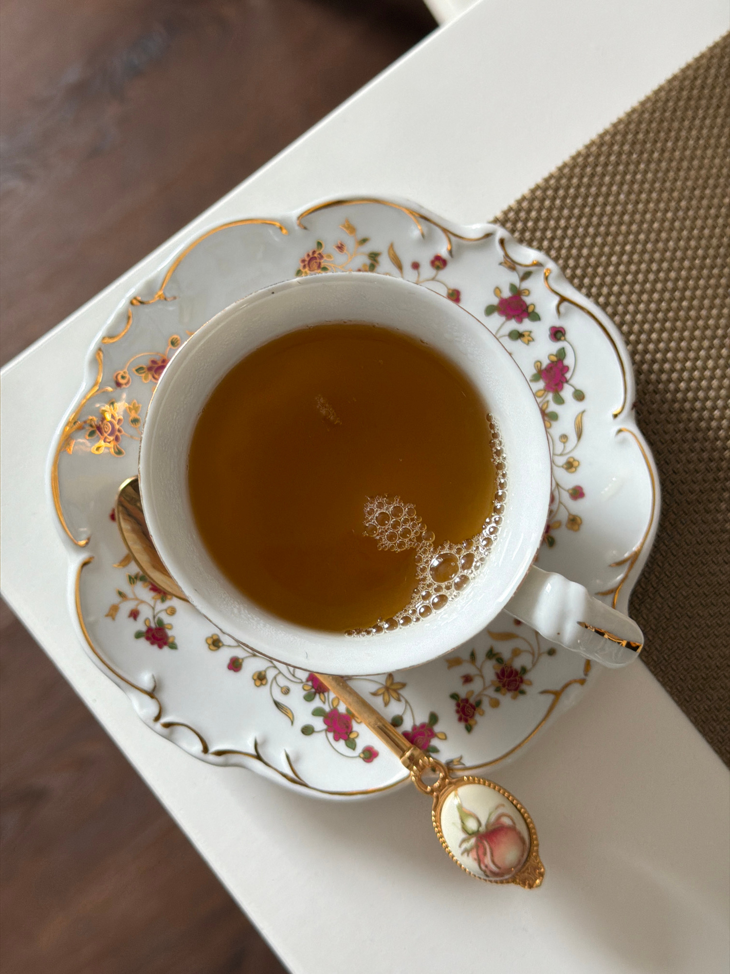 An overhead shot captures an elegant teacup filled with amber-colored tea, sitting on a matching saucer. The teacup is white porcelain with a delicate gold rim and a gold-accented handle. The tea with…read more