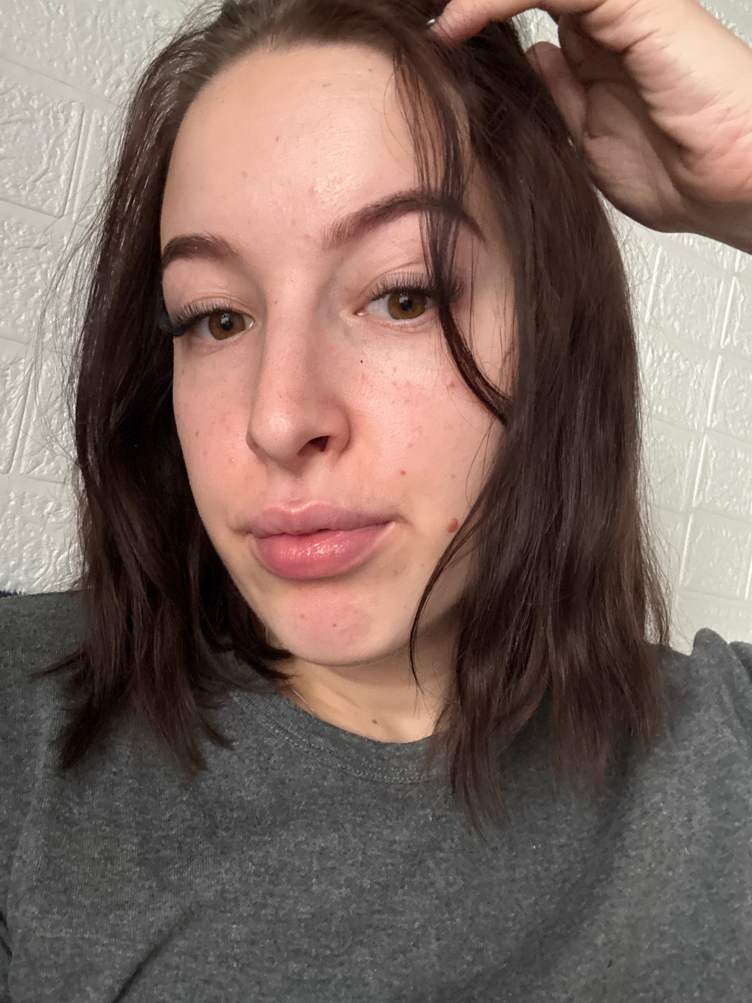 A close-up, slightly angled, indoor portrait of a woman with fair skin, brown hair, and brown eyes. She is wearing a gray t-shirt. Her hand is partially visible, touching her hair. The background appe…read more