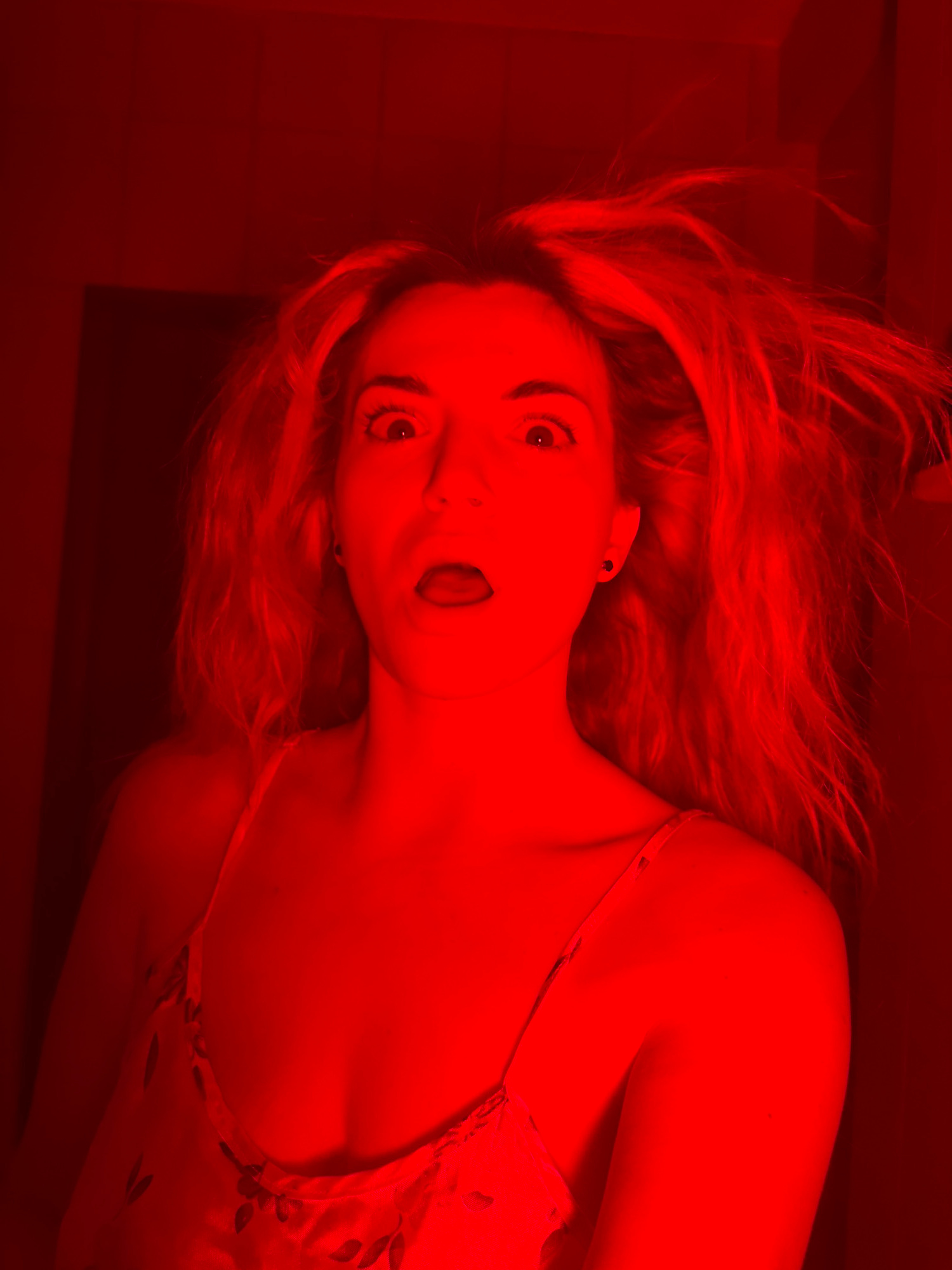 A woman with long, light-colored hair is lying on her back, looking at the camera with a surprised expression. Her mouth is slightly open, and her tongue is partially visible. She is wearing a light-c…read more
