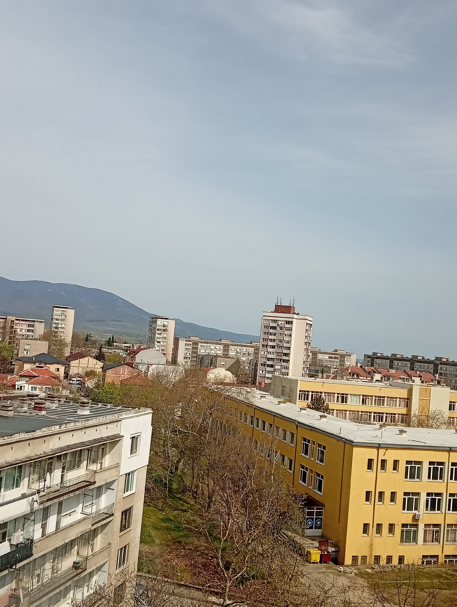 The image shows an urban landscape in Unknown, Unknown, featuring several buildings, a mountain range in the background, and a blue sky. The scene is viewed from an elevated position, possibly from a…read more
