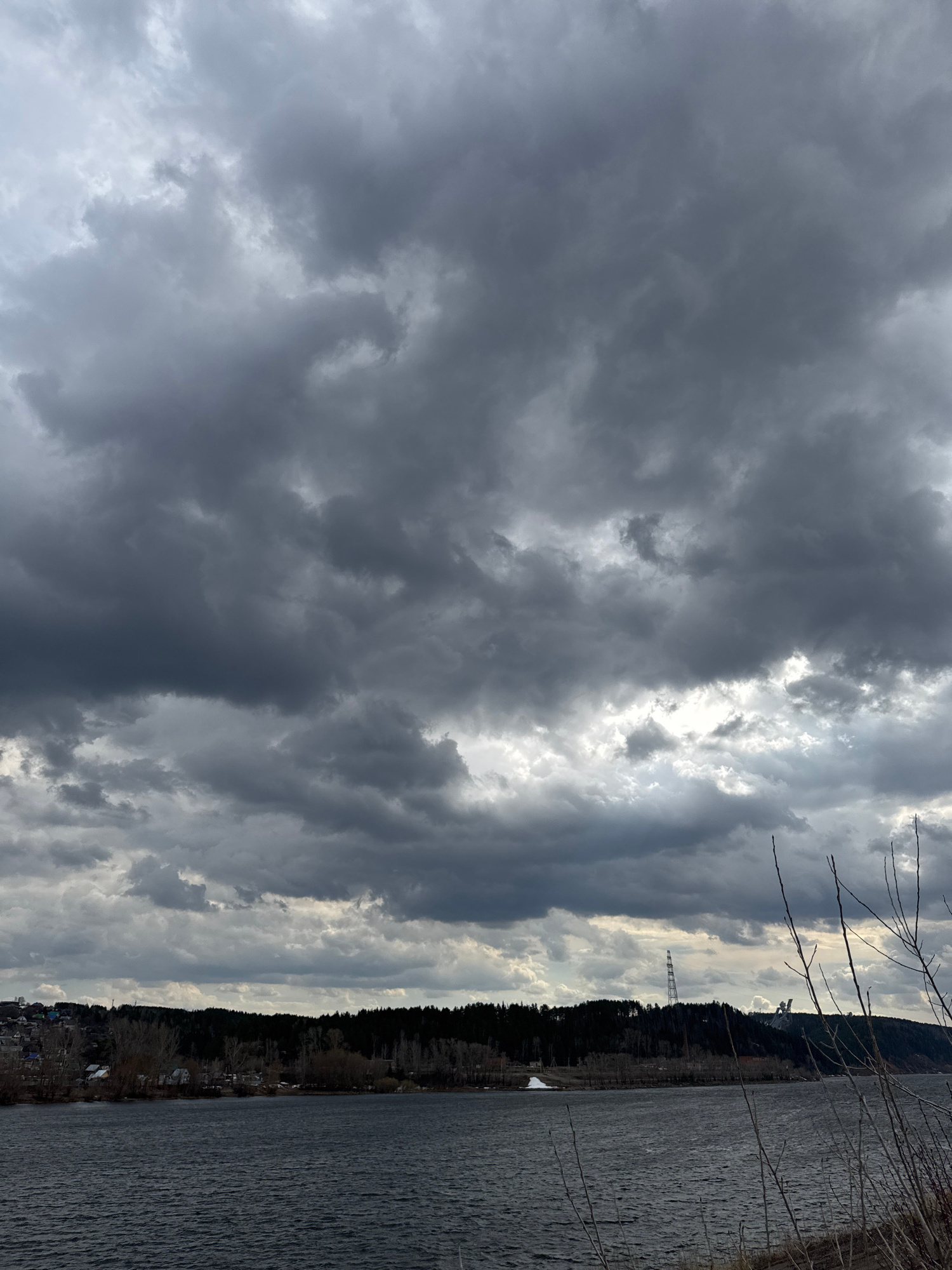 The image displays a dramatic landscape, oriented vertically, featuring a heavily clouded sky, a body of water, and a forested shoreline. The left and central portions of the frame are dominated by a…read more