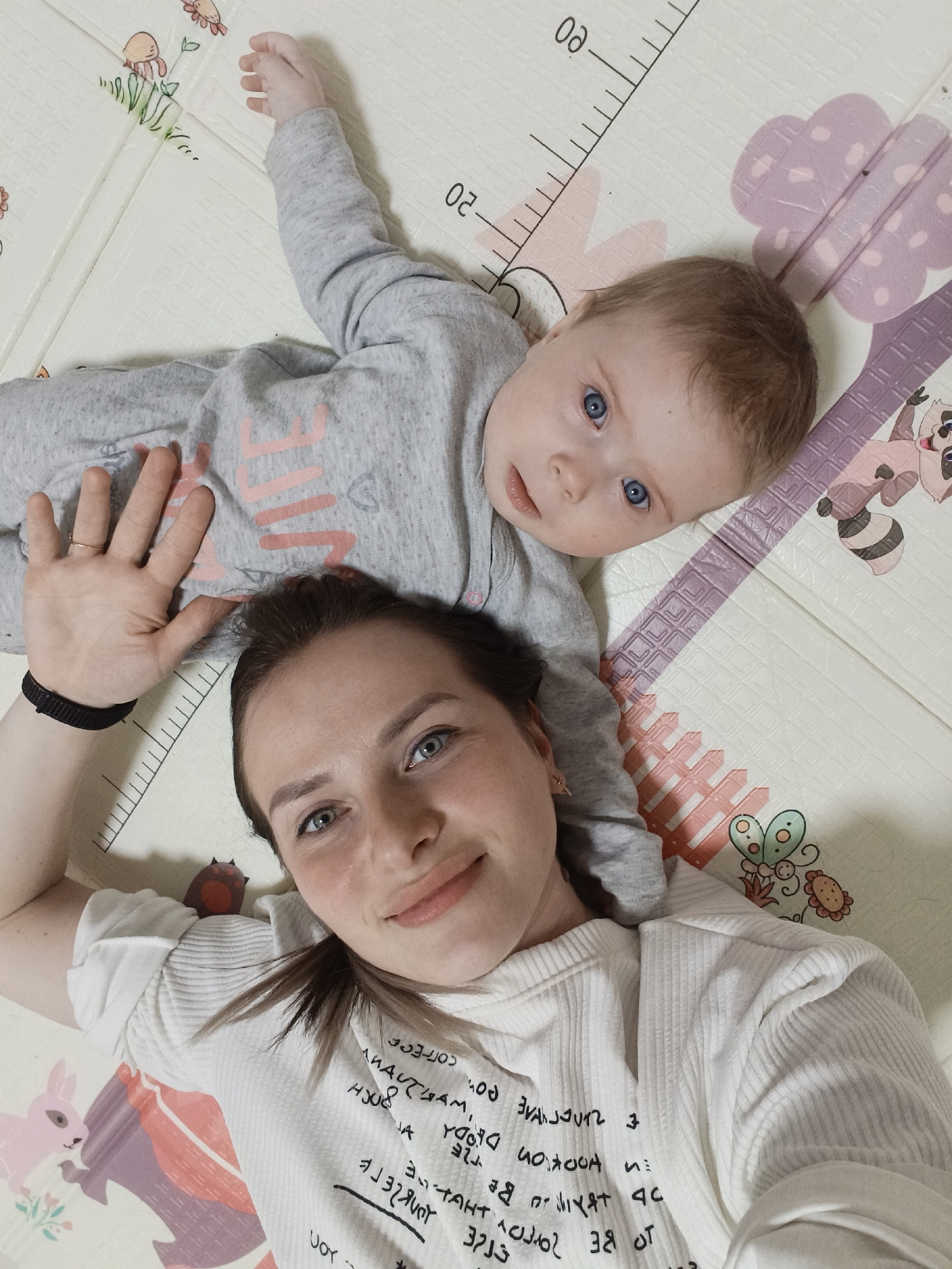 A woman and a baby are lying on a play mat. The woman is wearing a white shirt with black lettering and a black wristband on her left arm. The baby is wearing a grey onesie with pink lettering. They a…read more