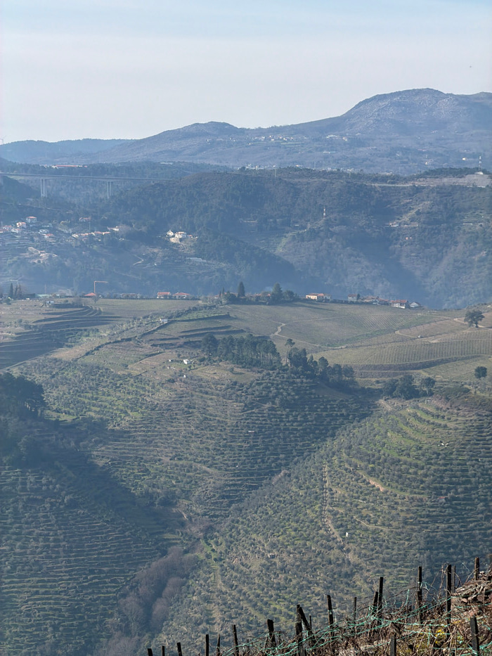 A landscape featuring terraced hillsides, densely covered with rows of trees or vines. A rugged mountain range stretches into the hazy distance on the left, contrasting with the cultivated slopes on t…read more