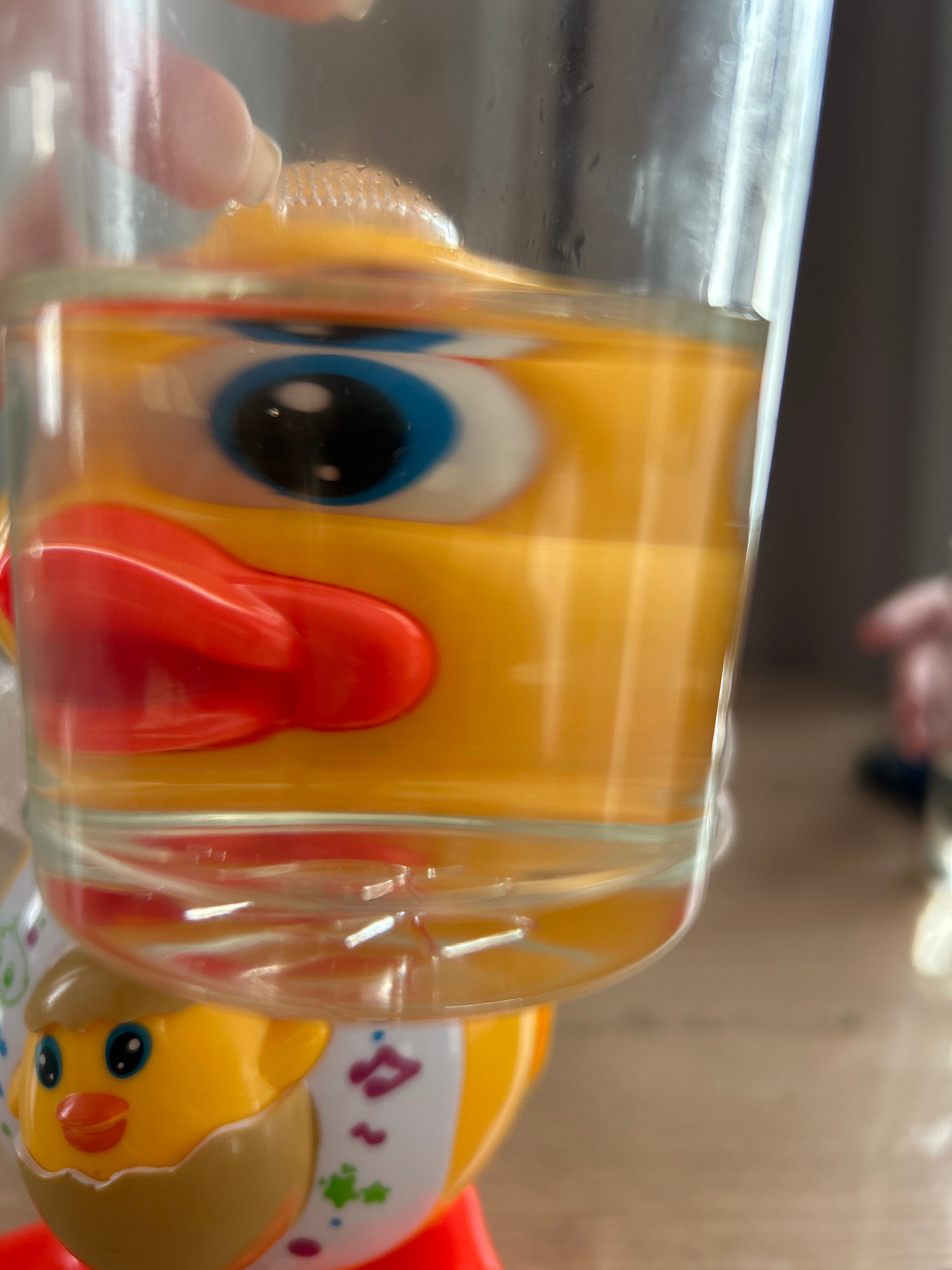 The image displays two toy characters, primarily visible within a clear, cylindrical container. The photograph is rotated clockwise, presenting the container horizontally. The main subject is a vibra…read more