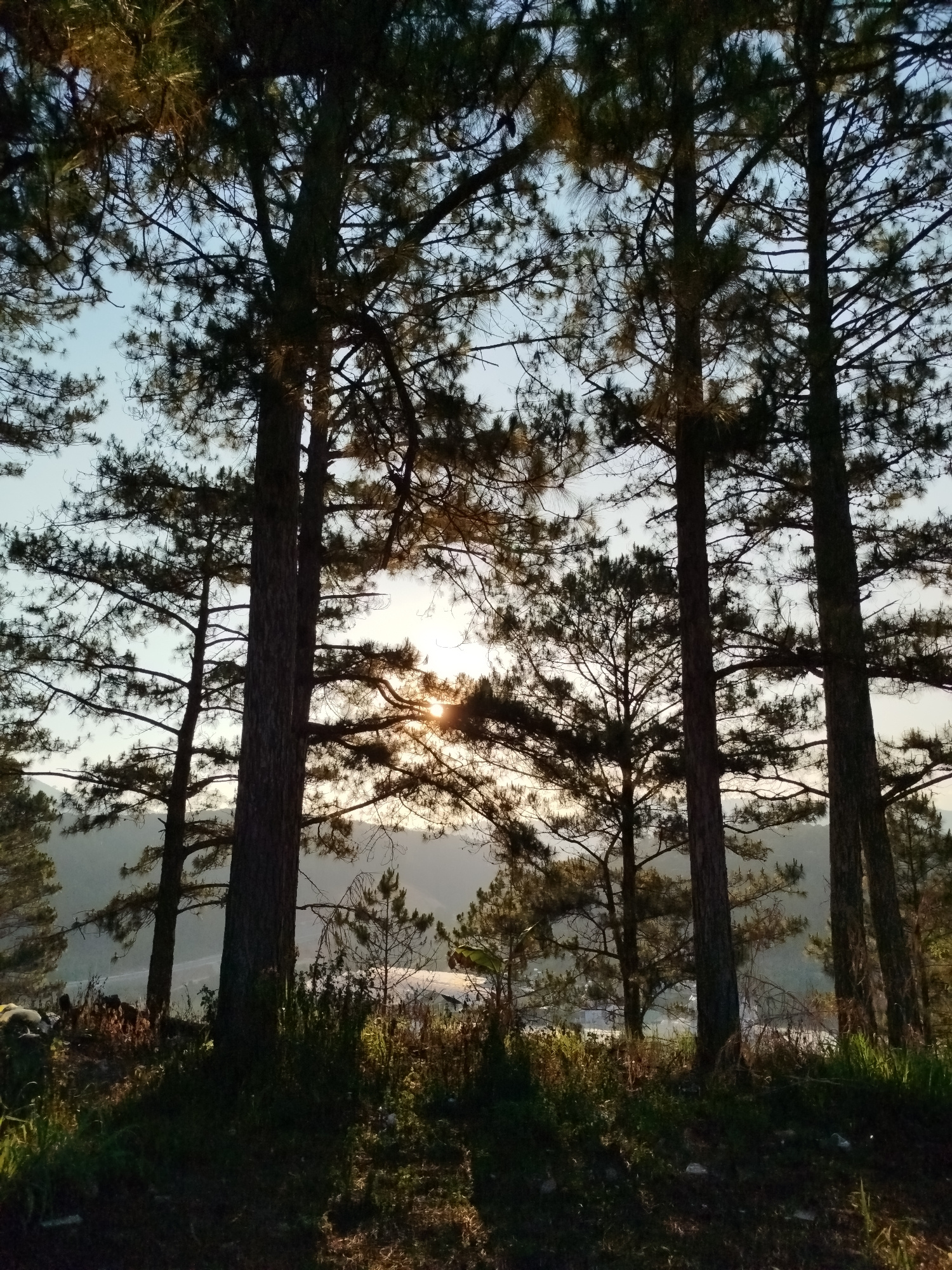 The image shows a view through pine trees, likely in Da Lat, Vietnam. The sun is visible through the branches, suggesting either sunrise or sunset. The trees are silhouetted against the sky, and the u…read more