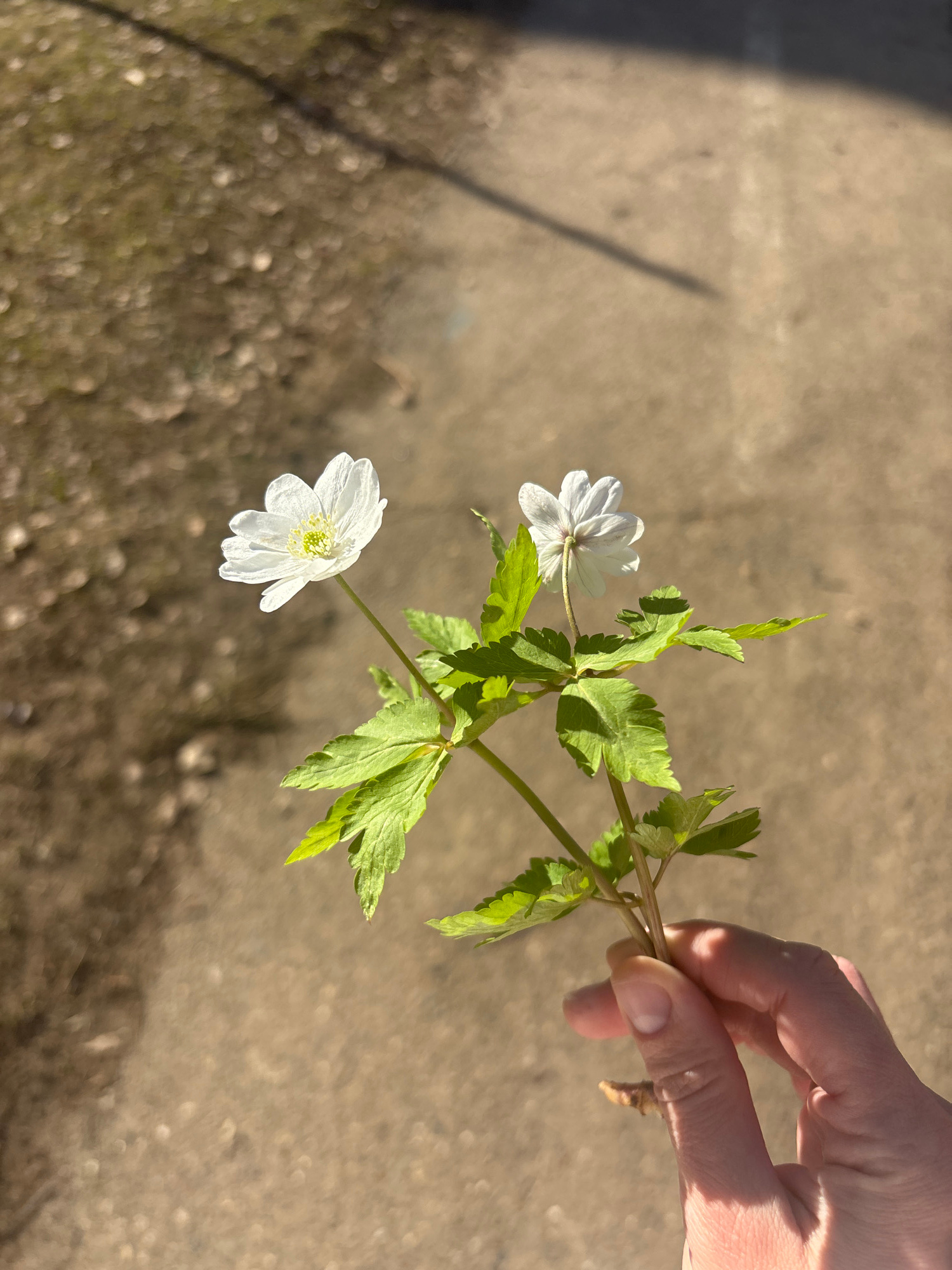 A hand holds a sprig of green vegetation with two white flowers with yellow centers against a blurred background of concrete and grassy earth. The precise location in Chaikovsky, Russia, is impossible…read more