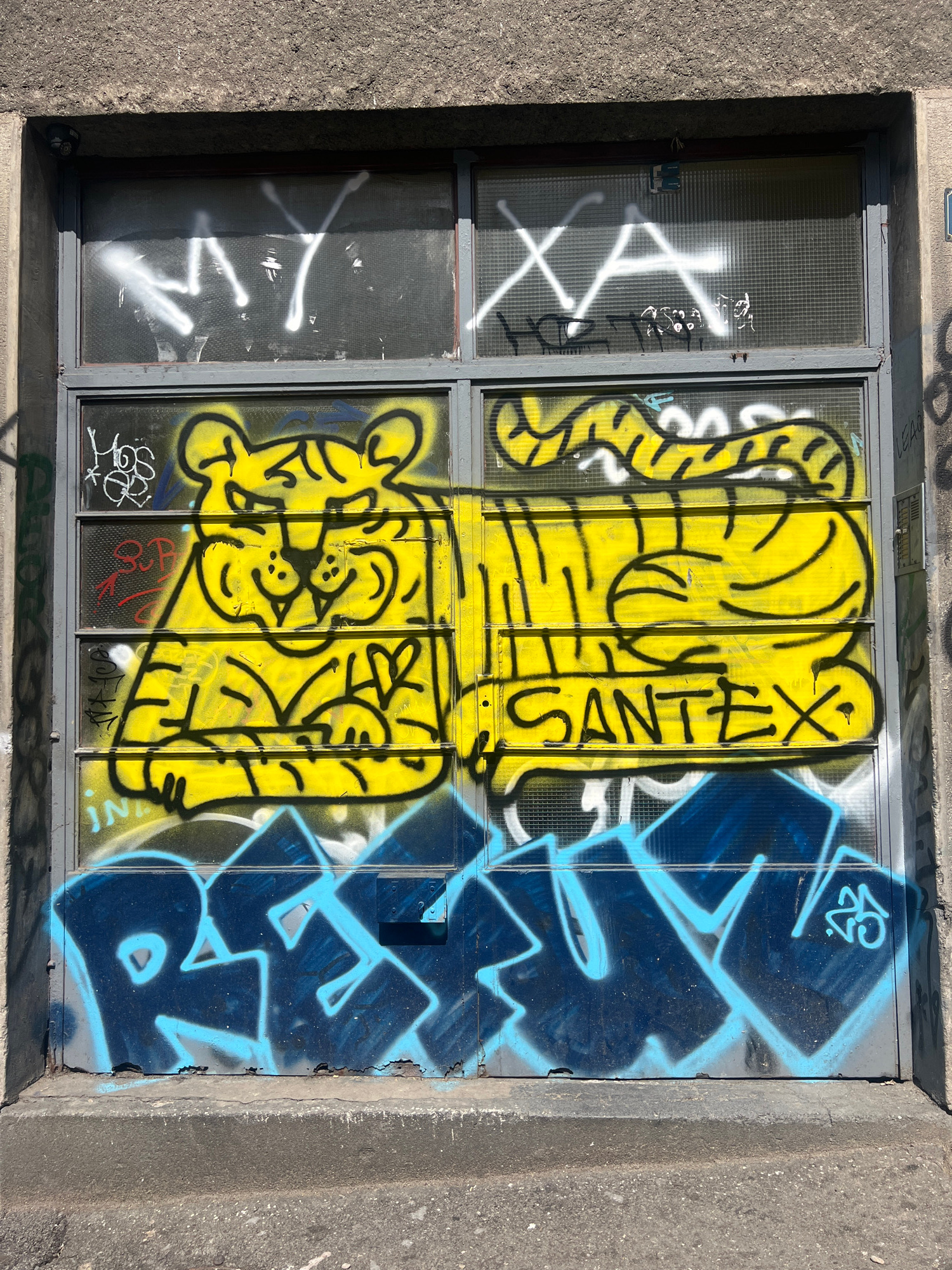 The image shows a metal-framed window with wire-reinforced glass covered in graffiti. The graffiti is multicolored with a prominent yellow tiger-like cartoon figure and the word "Sante". The backgroun…read more