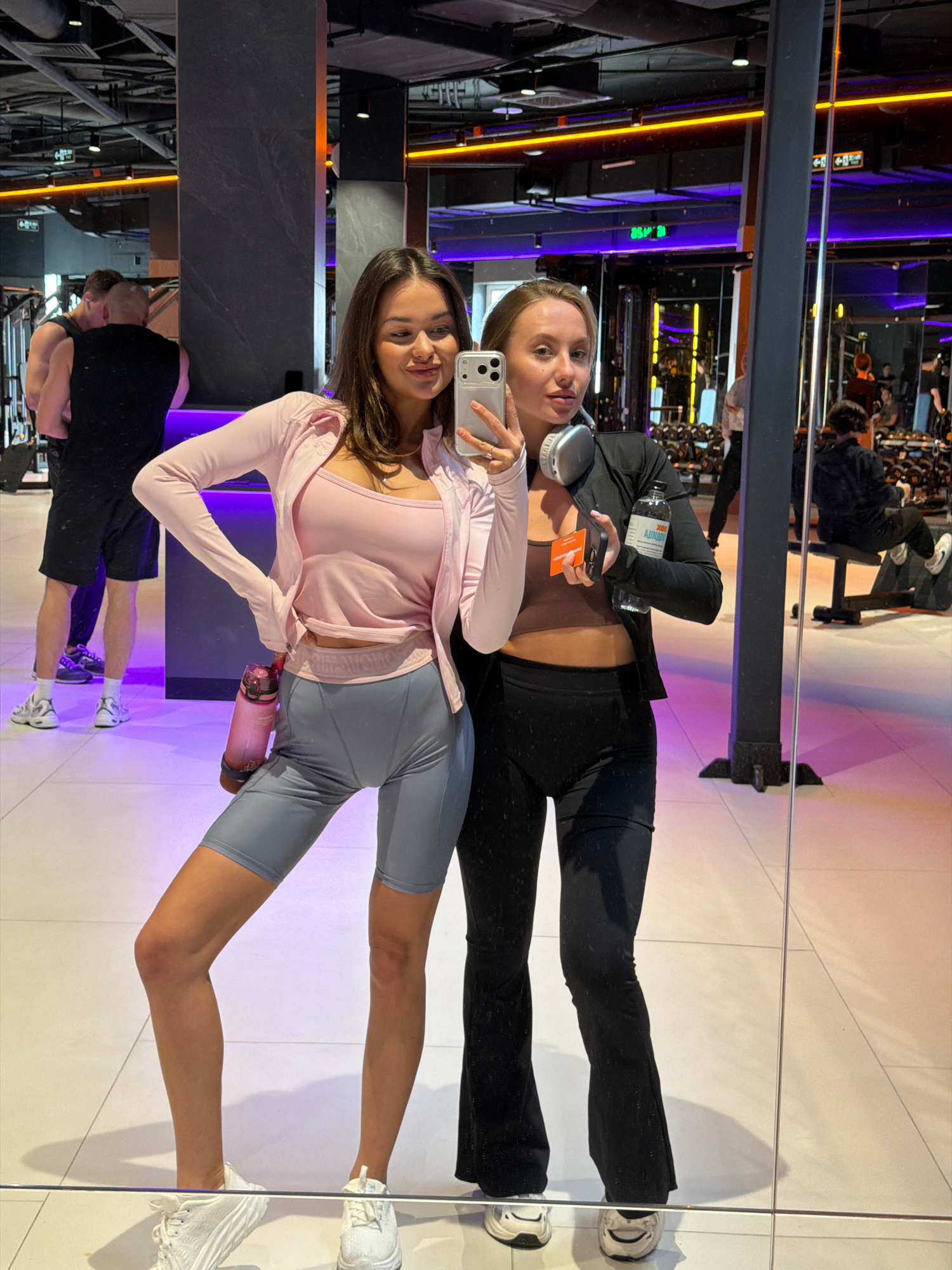 Two young women are posing for a selfie in what appears to be a gym in Krasnoyarsk, Russia. The gym equipment is visible in the background. The woman closer to the camera has long brown hair and is we…read more