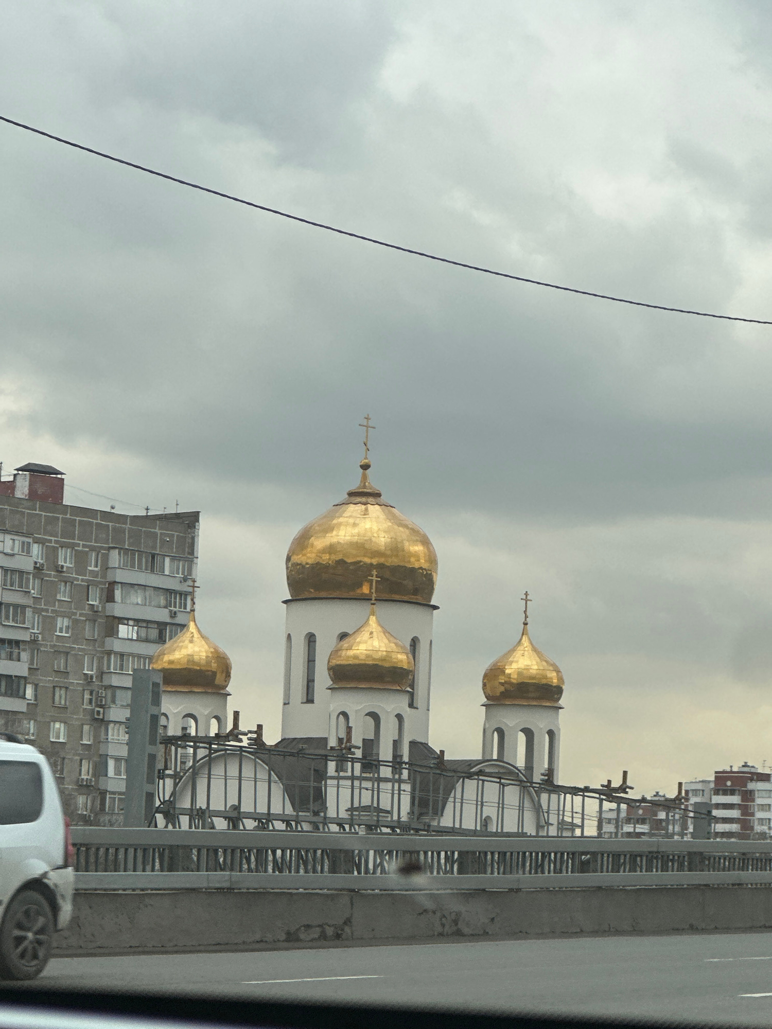 The image depicts a Russian Orthodox church with multiple golden domes against a cloudy sky. The church has white walls with arched windows. It appears to be located in an urban area with residential…read more