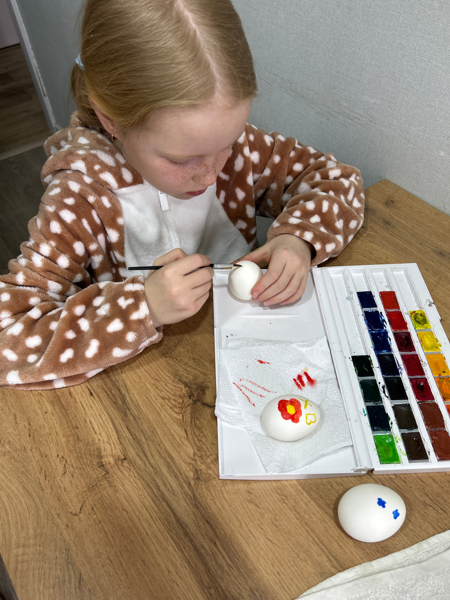 A high-angle indoor shot shows a young girl in a brown and white spotted onesie painting Easter eggs at a table. The girl, with blonde hair and freckles, is focused on her task. She holds a white egg…read more