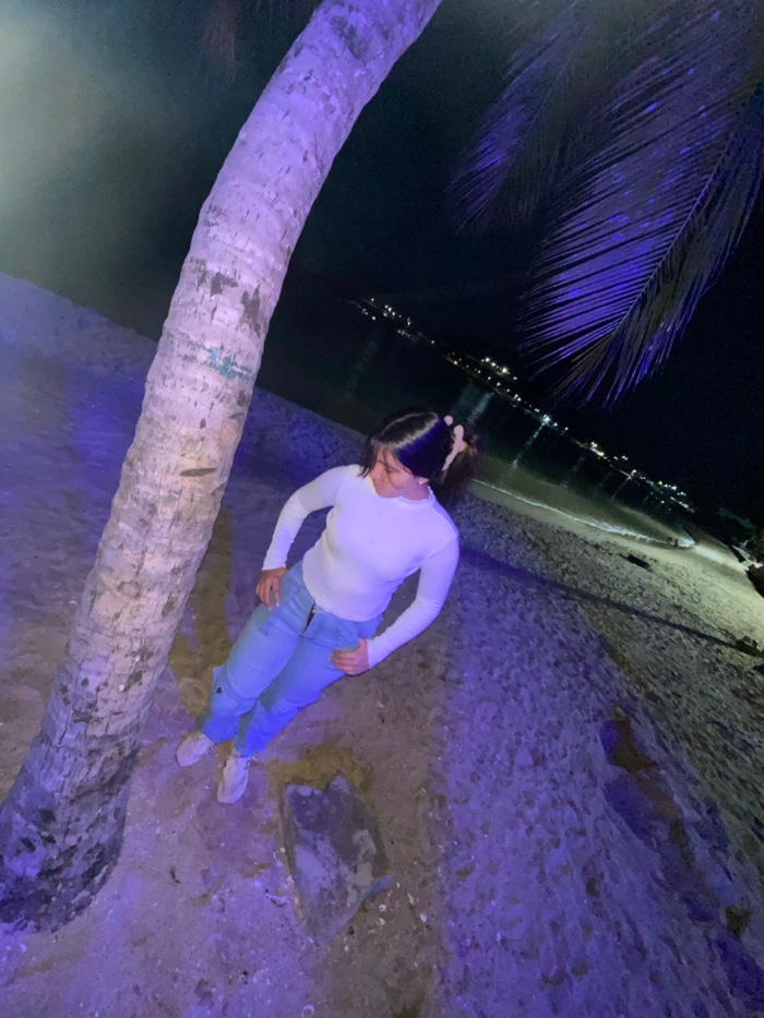 The image captures a nighttime scene on what appears to be a beach or shoreline, illuminated by a strong purple-blue artificial light. The camera angle is tilted, causing the ground and horizon to app…read more