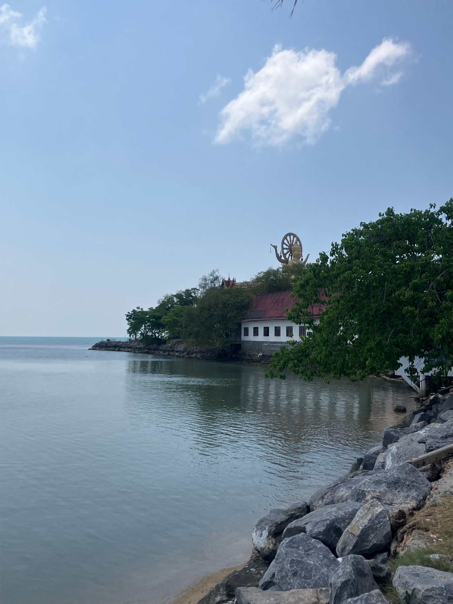 The image shows a view of Wat Plai Laem in Baan Plai Laem, Thailand. A white building with a red roof and rows of windows is visible, partly obscured by trees. A large golden statue of a figure holdin…read more