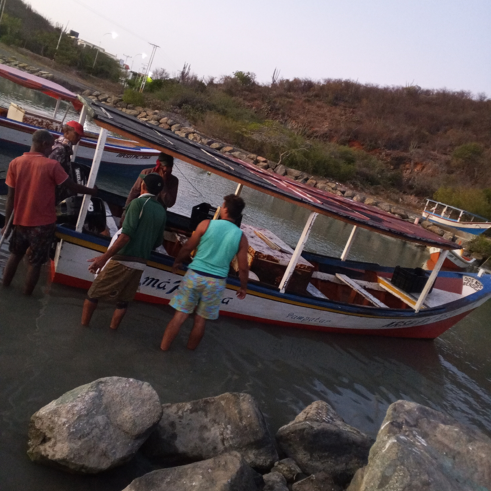 The image shows a group of men standing in shallow water near a boat, possibly in the coastal city of Pedro González, Venezuela. The boat, which appears to be a small fishing vessel or water taxi, has…read more