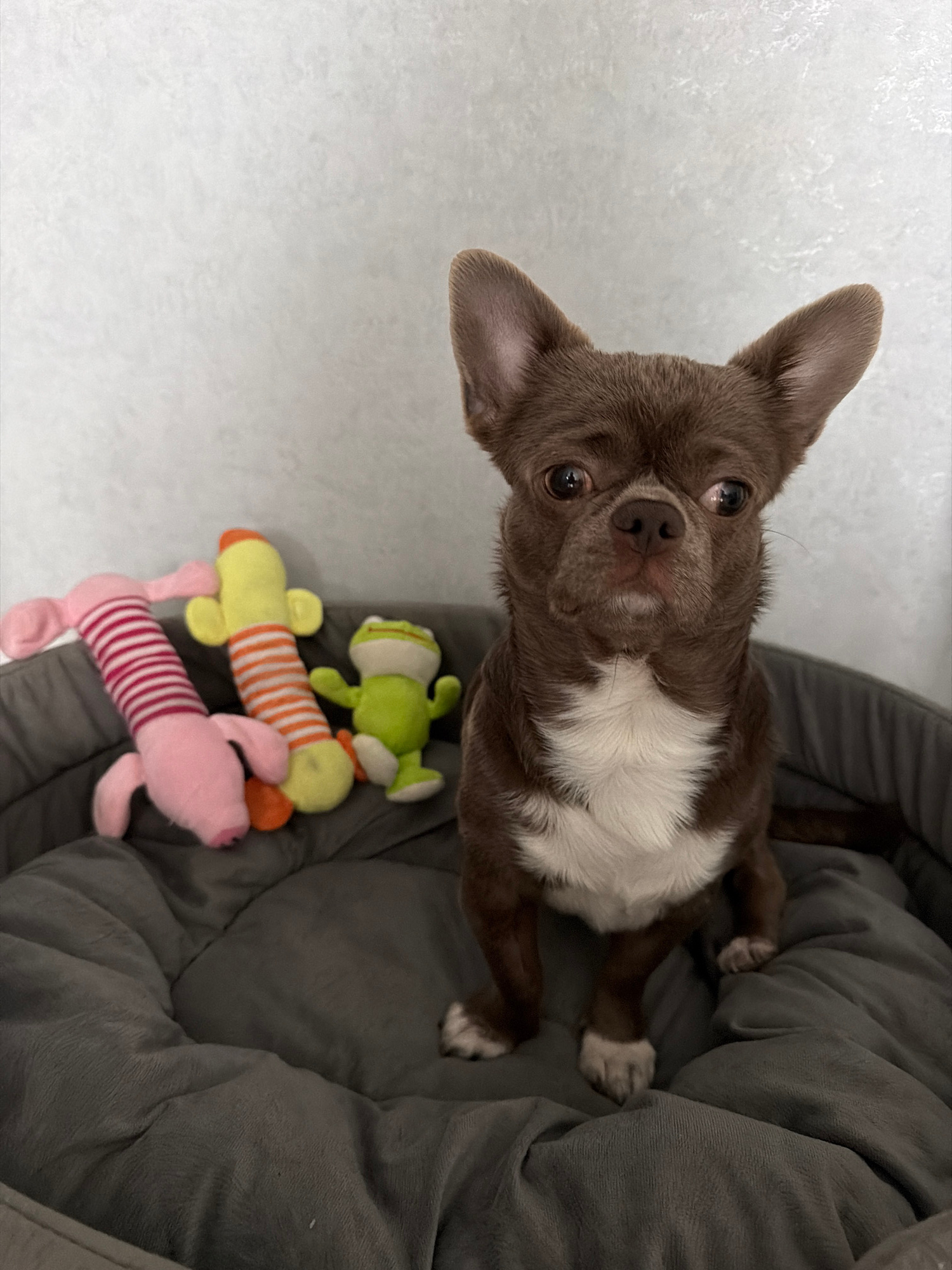 A brown and white Chihuahua is lying on a grey dog bed next to three stuffed animal toys: a green frog, a yellow and orange striped creature, and a pink and red striped creature. The Chihuahua is look…read more