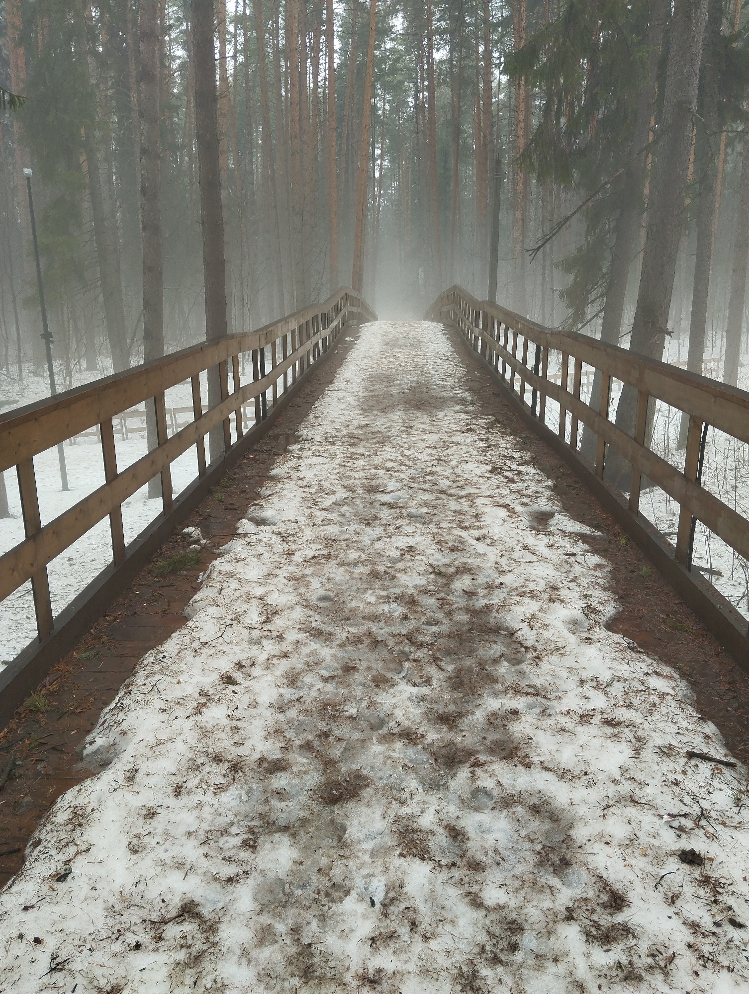 The image depicts a wooden bridge in a forest setting, likely in a park. The bridge deck is covered with melting snow mixed with dirt and debris, suggesting a thaw. Wooden railings line both sides of…read more