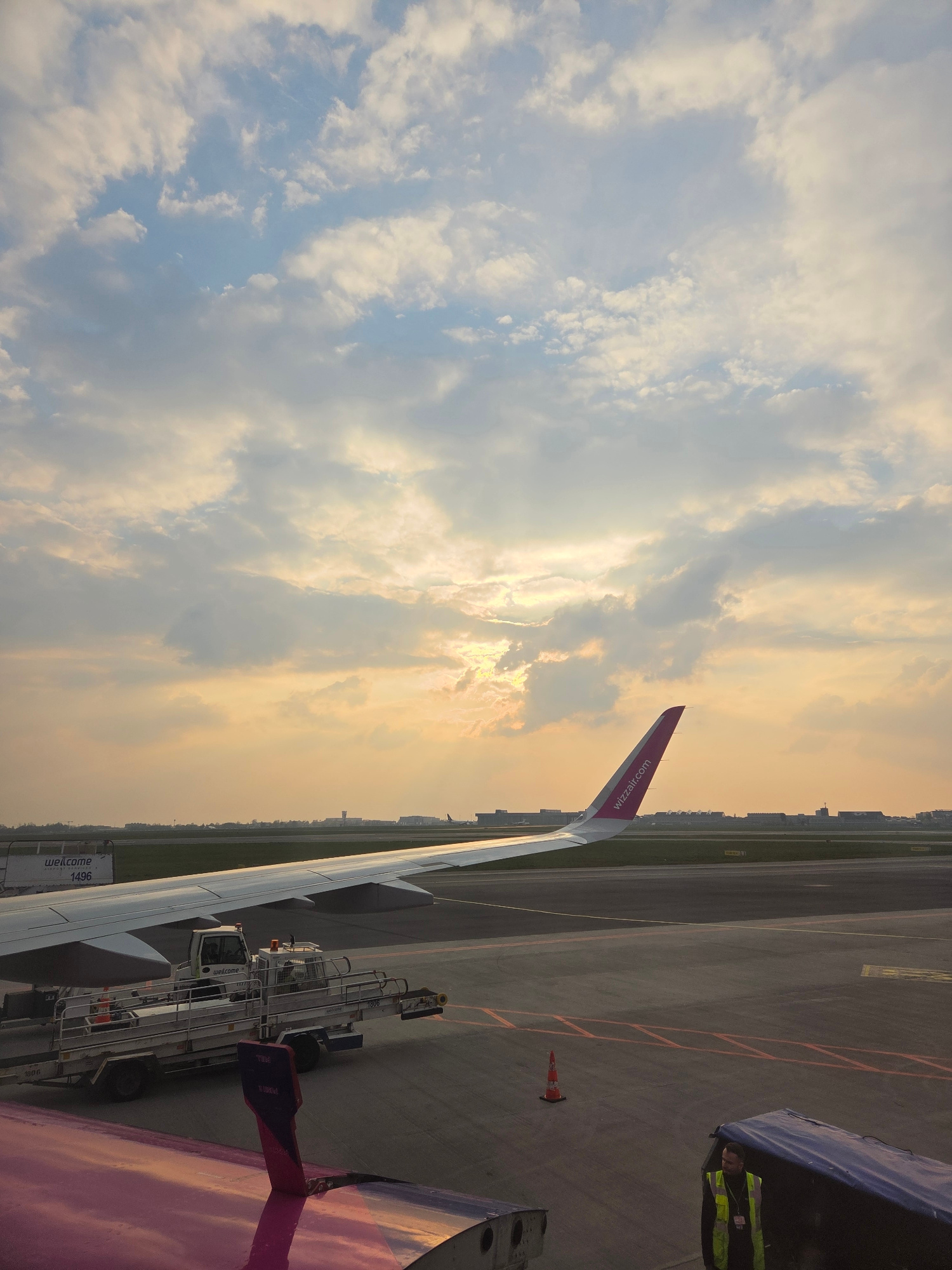 The image, rotated counterclockwise, shows a partial view from an airplane window, likely at an airport. The right side of the image features the tarmac and part of the plane, including the wing with…read more