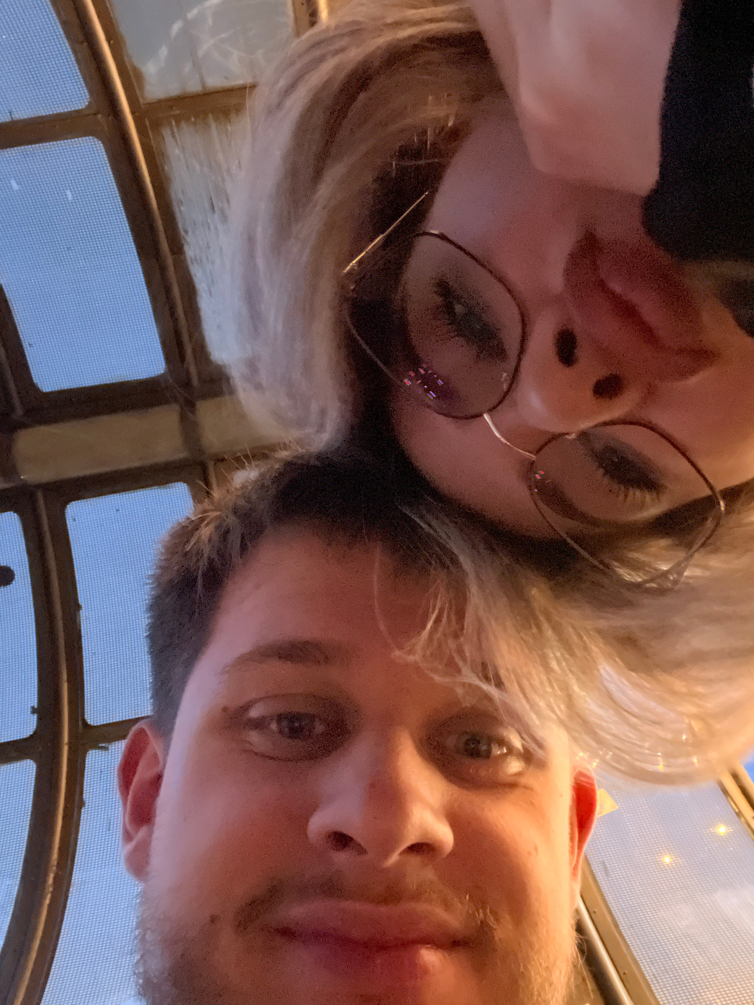 Two people, a man and a woman, are posing for a selfie indoors. The woman is on the left side of the image, and she wears glasses. The man is on the right side of the image and has short brown hair. T…read more