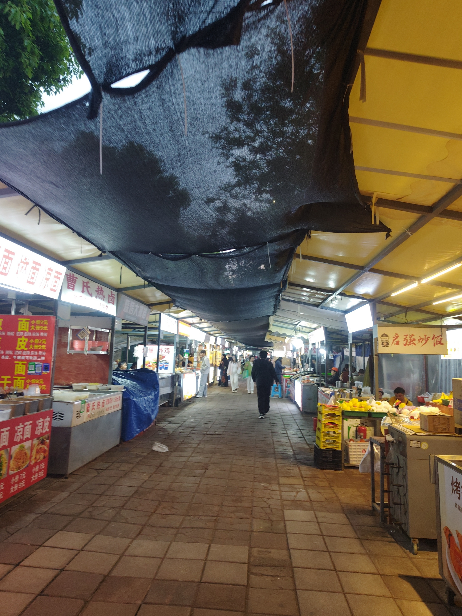 Here is a description of the image: The image shows a street scene, seemingly a food market in Shapingba District, China. The scene is dominated by a covered walkway, with a black mesh-like material…read more