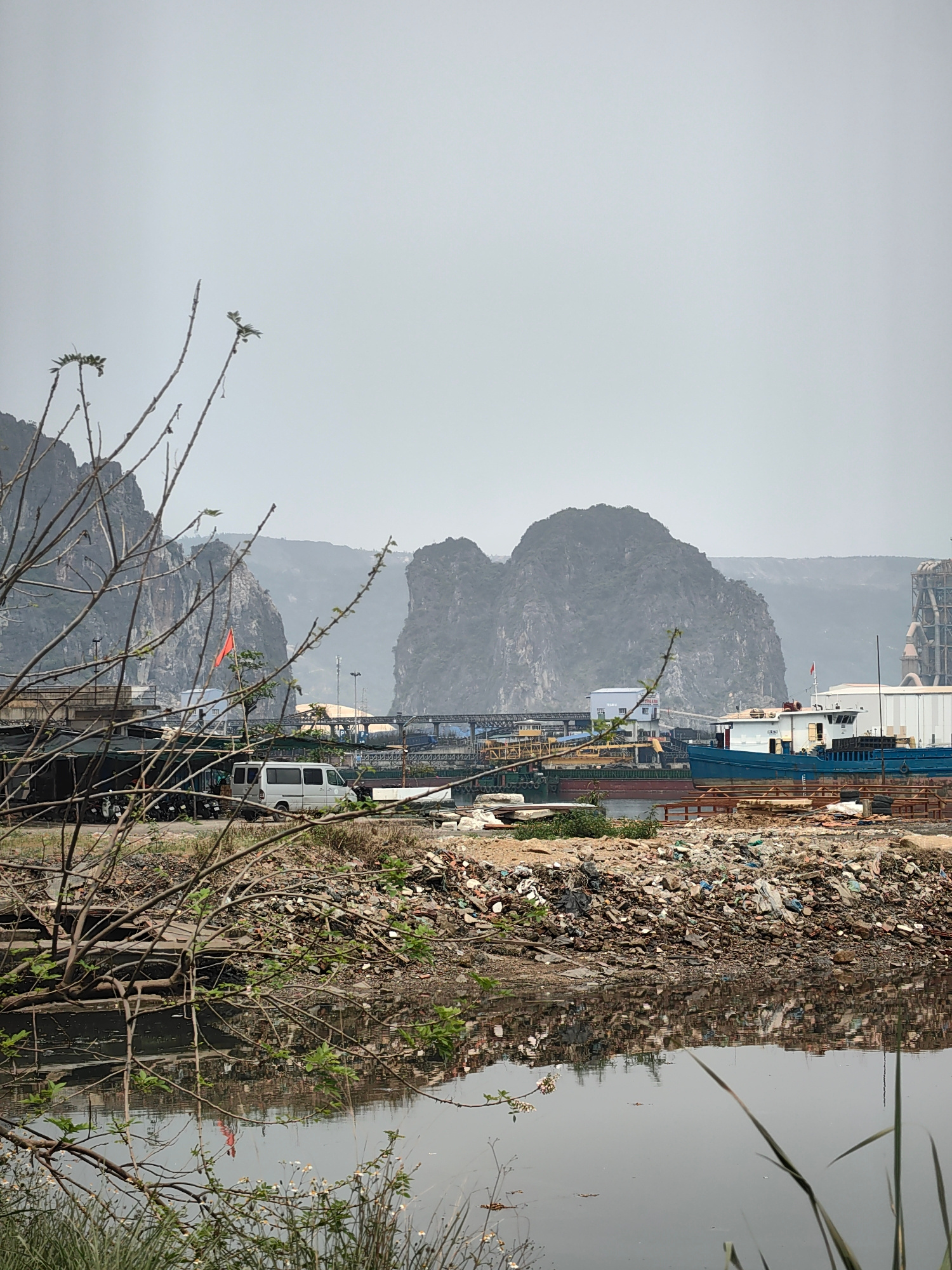 The image depicts a polluted waterway in Quang Hanh Ward, Vietnam. A large pile of trash and debris lines the bank of the water, with a reflection of the debris visible in the water. In the background…read more