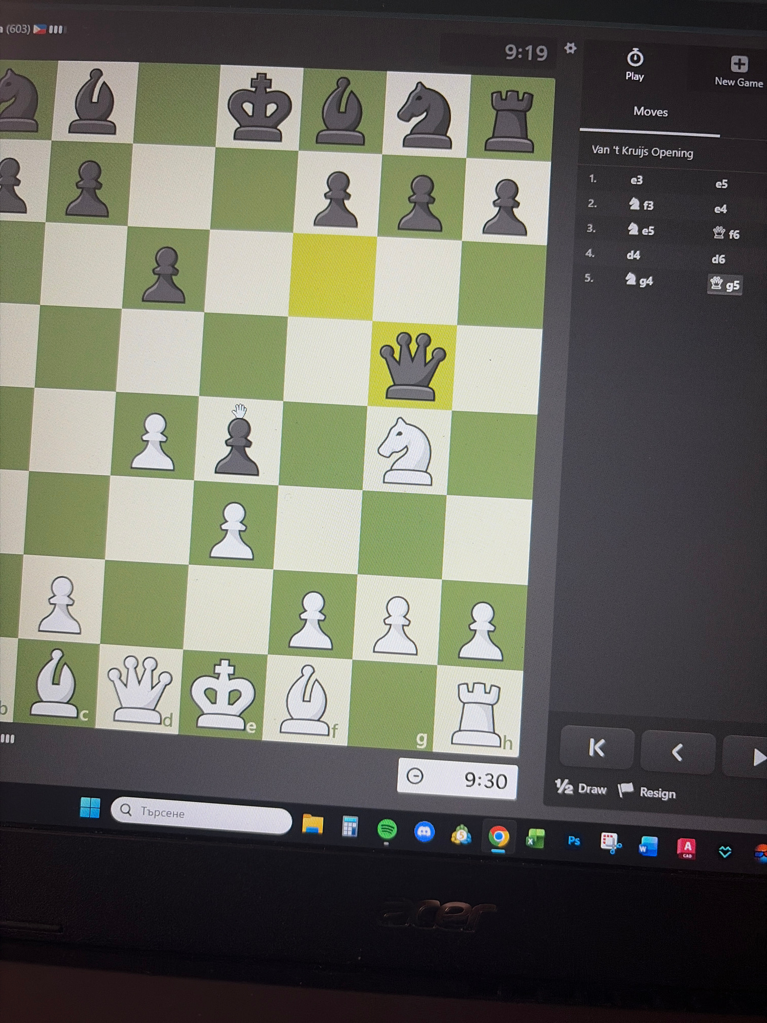 The image shows a chess game in progress on a computer screen. The chess opening is identified as the Van 't Kruijs Opening. The recorded moves are 1. e3 e5, 2. f3 e4, 3. e5 f6, 4. d4 d6, 5. g4 g5. Th…read more