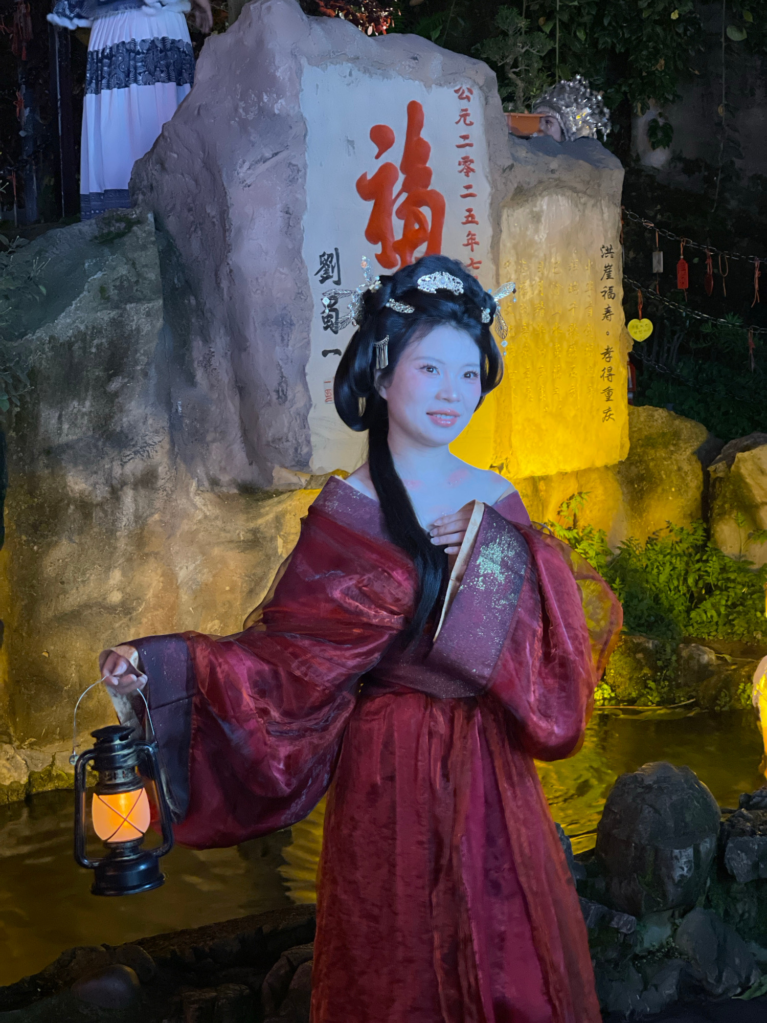 An East Asian woman, positioned centrally, smiles slightly while holding an illuminated black lantern in her right hand. She wears a dark red traditional Chinese-style garment with gold accents and an…read more