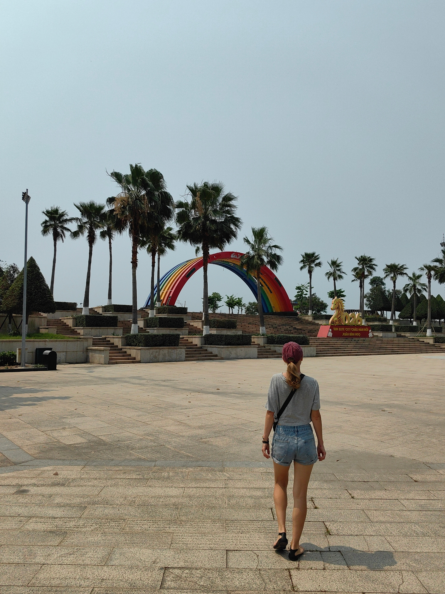 The image shows a woman from behind, walking away from the viewer on a large, paved area in Bai Chay Ward, Vietnam. She is wearing a grey t-shirt, denim shorts, a maroon cap, and black sandals. A blac…read more