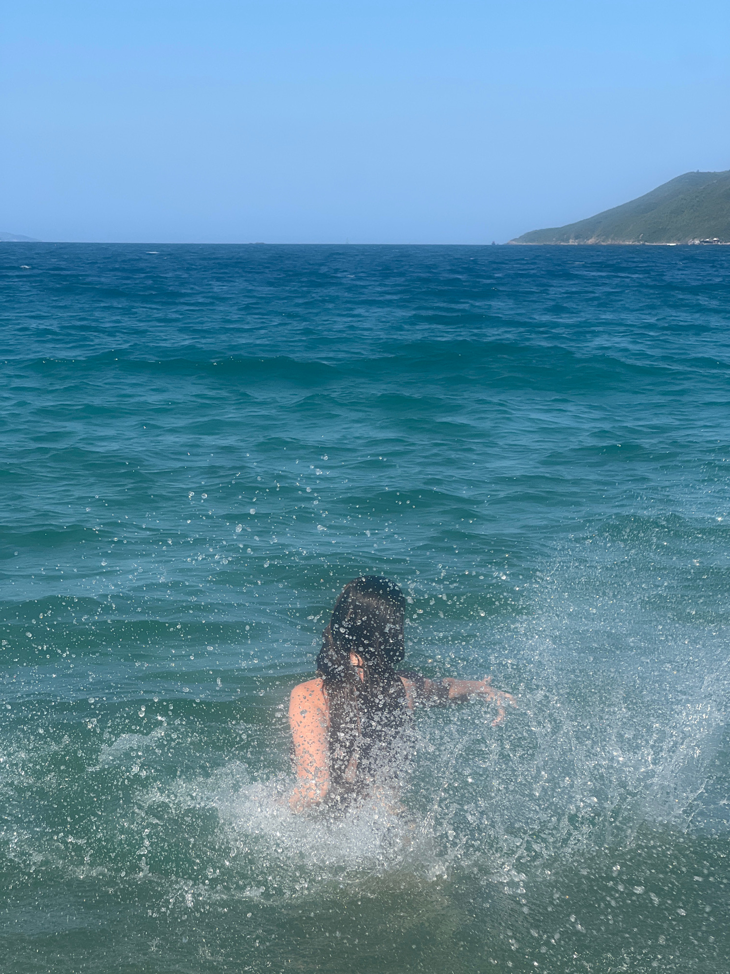 The image displays a coastal scene in Nha Trang, Vietnam. A single individual is depicted from behind, partially submerged in turquoise-green ocean water, actively splashing. The person has long, dark…read more