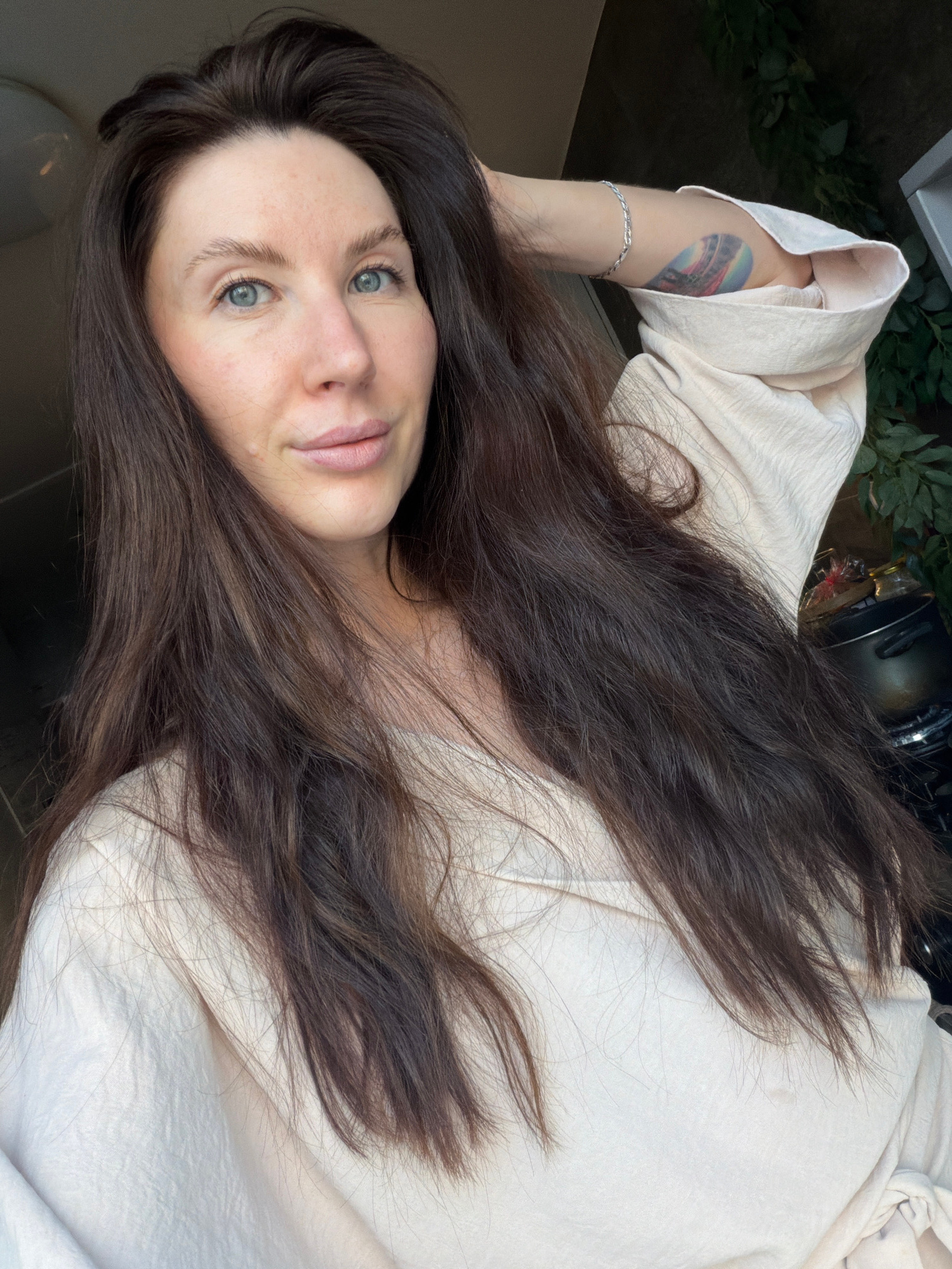 A medium-shot, portrait photograph taken indoors, depicts a woman with long, dark brown hair lying on what appears to be a white fabric or bedsheet. Her head is positioned in the lower-left corner of…read more