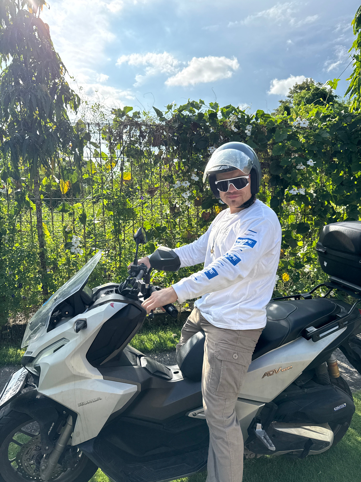 A person wearing a helmet and sunglasses is sitting on a white and gray Honda ADV 160 motorcycle. The motorcycle is parked on grass next to a fence covered in green vines and white flowers. The person…read more