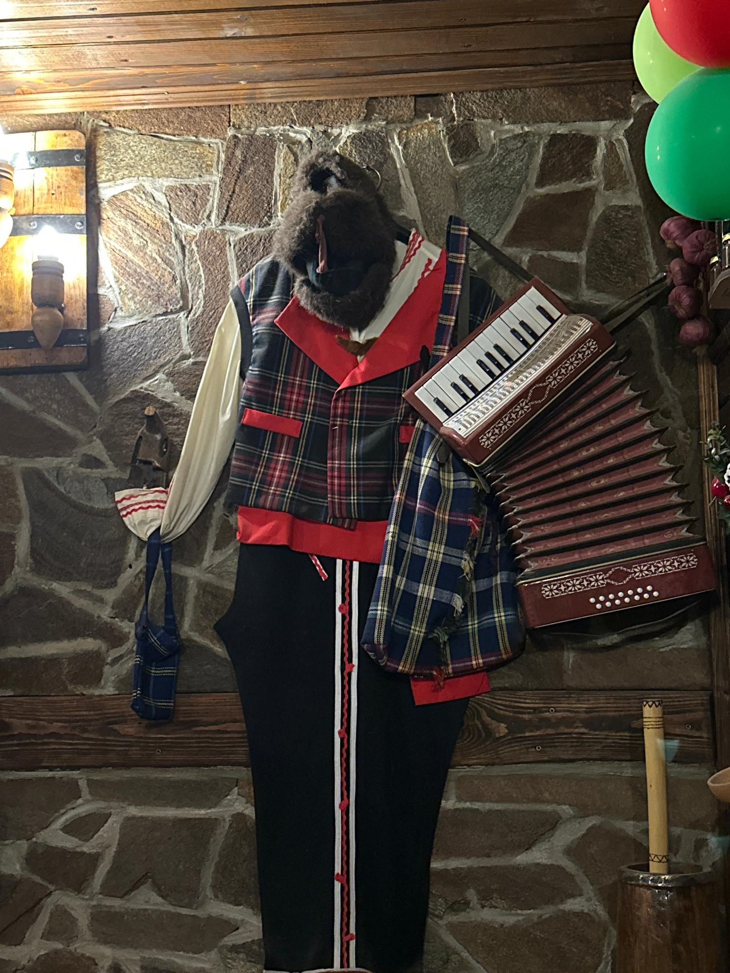 The image shows a display on a stone wall in what appears to be an interior setting. Dominating the scene are traditional Bulgarian folk items, including a button accordion (likely a Garmon), a woolen…read more