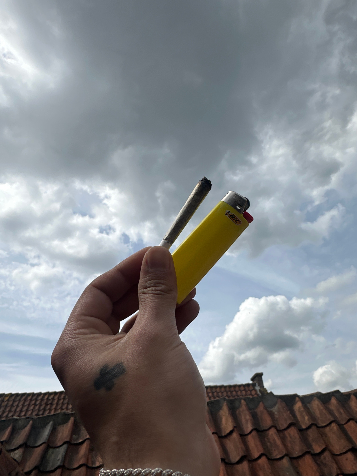 The image, captured in Amersfoort, Netherlands, is a low-angle shot looking upwards towards a dynamic, cloudy sky. In the foreground, a human hand holds a bright yellow BIC lighter and a hand-rolled c…read more