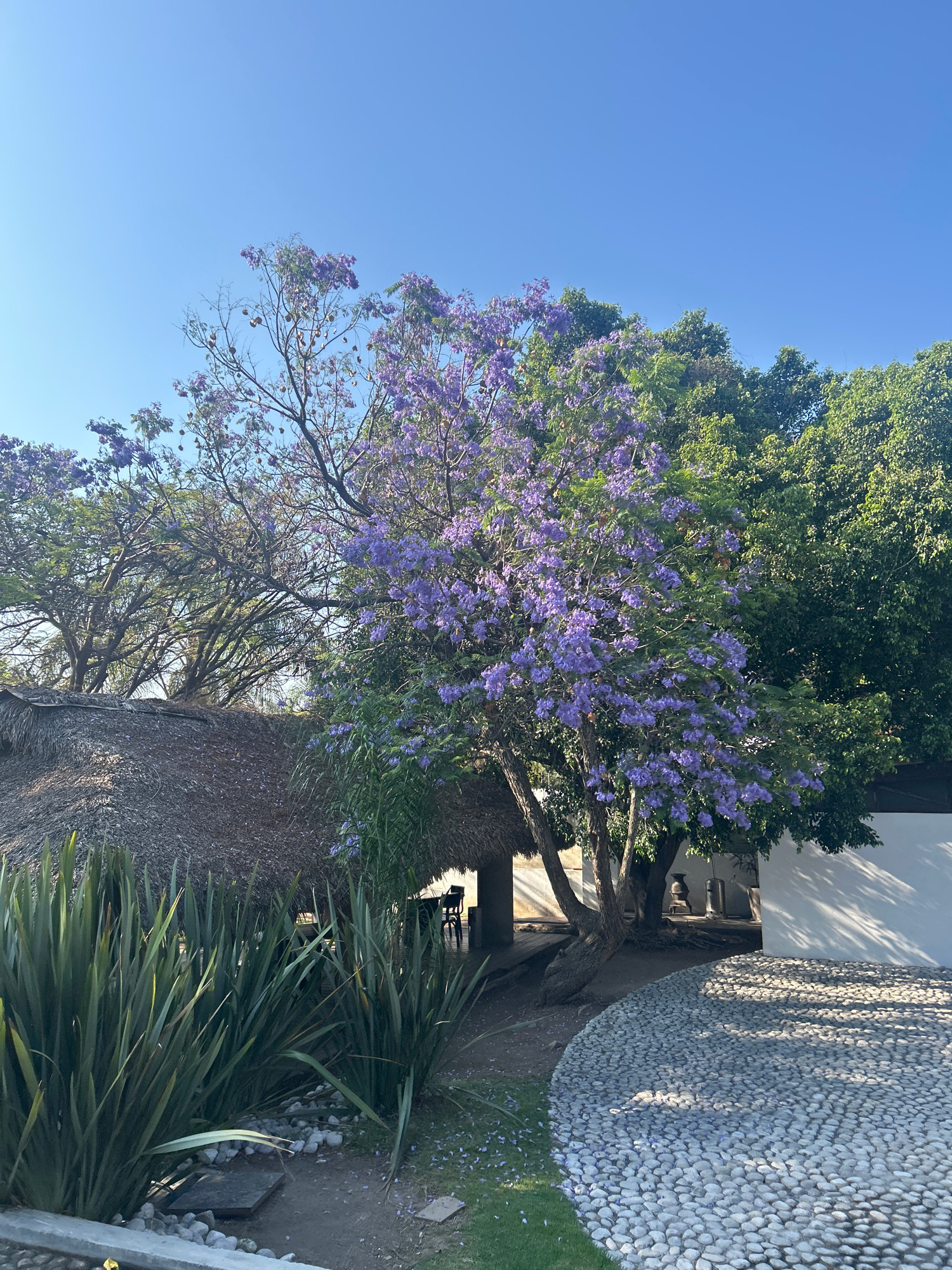The image shows a jacaranda tree in full bloom with vibrant purple flowers. The tree is positioned near a building with a white wall covered in shadows and a pebble-paved area. A second tree is visibl…read more