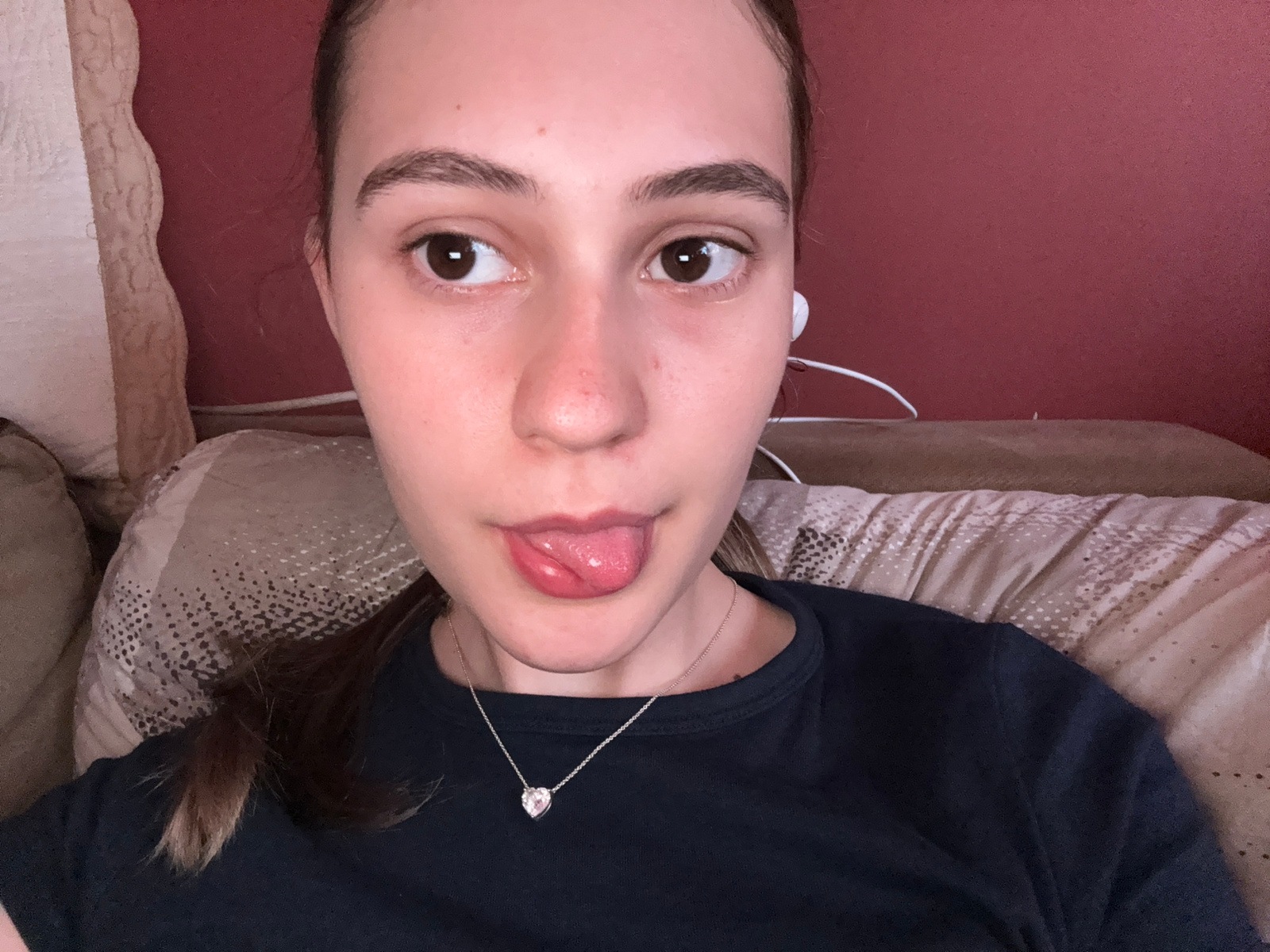 A person with brown hair and brown eyes lies on a bed in a room with red flooring. The person wears a dark shirt and a silver necklace with a heart-shaped pendant. They stick out their tongue and appe…read more