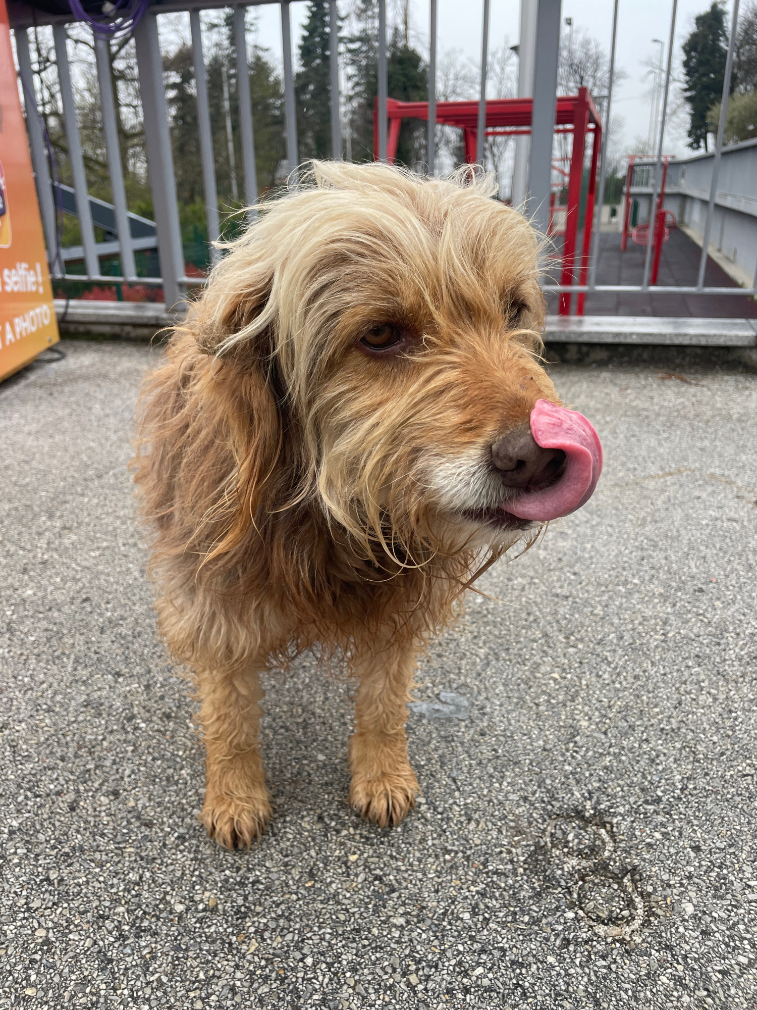 A medium-sized, light brown dog with long, shaggy fur sits on a gray asphalt surface. Its head is turned to the left, and its long, pink tongue is extended, licking its nose. In the background, a gray…read more
