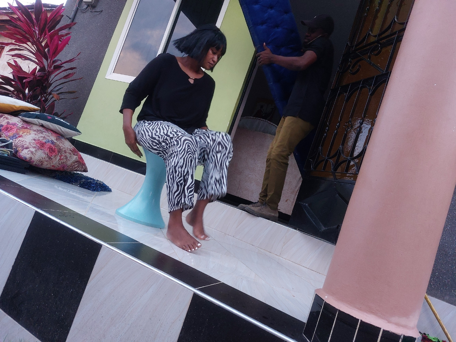 A woman is seated on a blue, cone-shaped stool on the tiled porch of a building, with a man behind her carrying a blue item. The woman has dark hair and is wearing a black long-sleeved shirt and zebra…read more