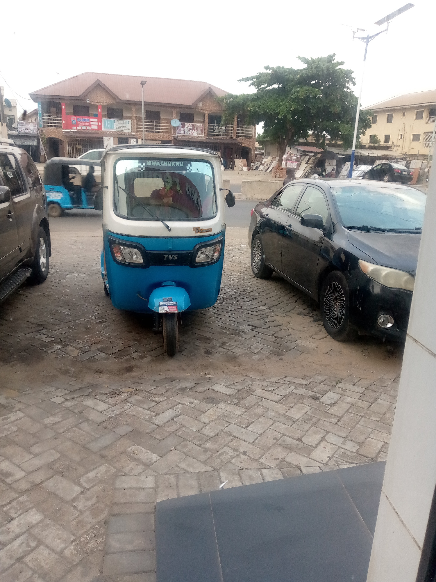 The image presents an urban scene in Asaba, Nigeria. A light blue and white TVS King tricycle ("keke") is parked prominently in the foreground. A black sedan is parked behind it. A gray SUV is partial…read more