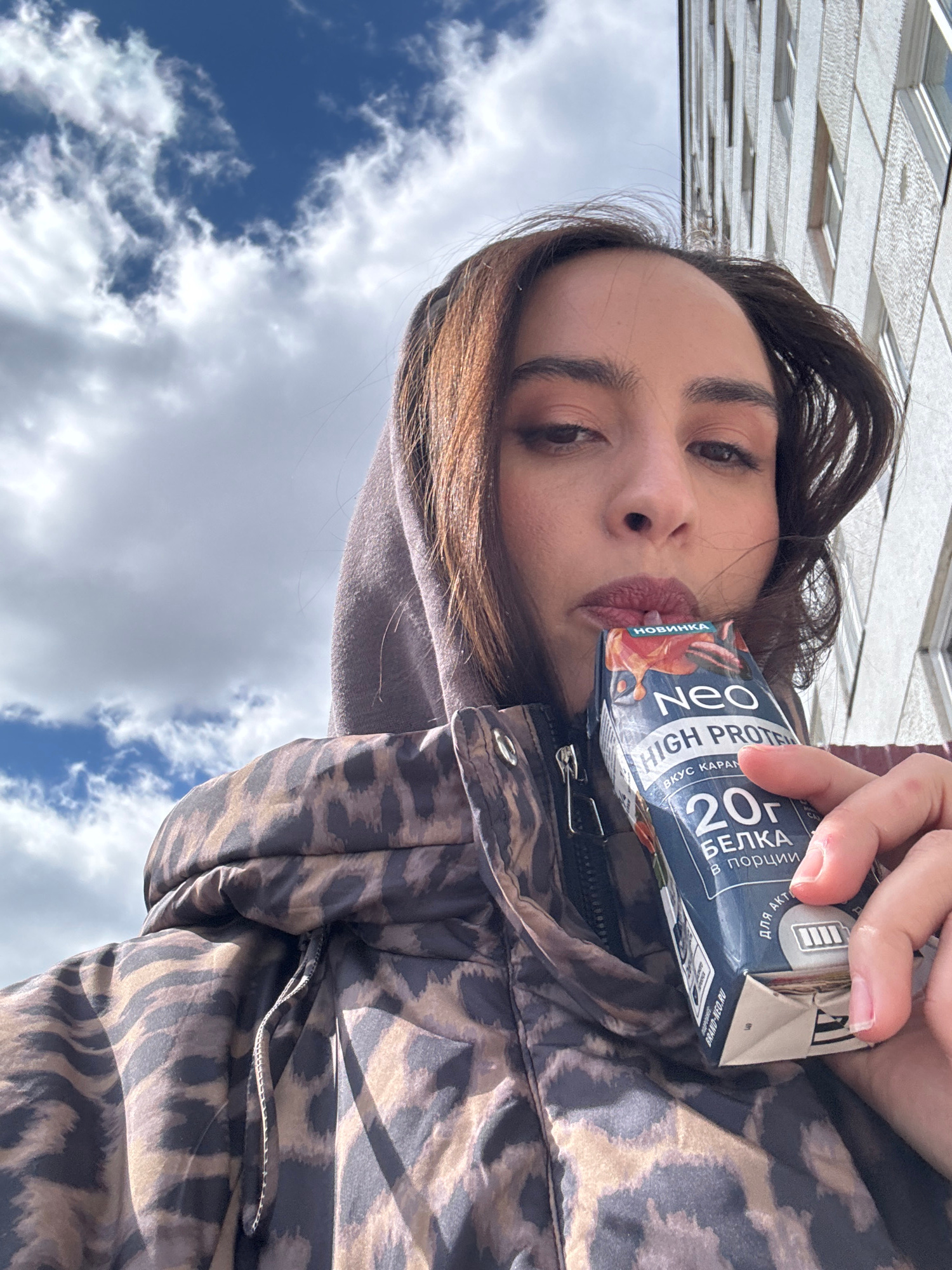 A woman with dark hair and brown eyes holds a "Neo High Protein" drink up to her lips. The drink's packaging is blue and white, with text in Russian. The woman is wearing a brown and tan animal print…read more